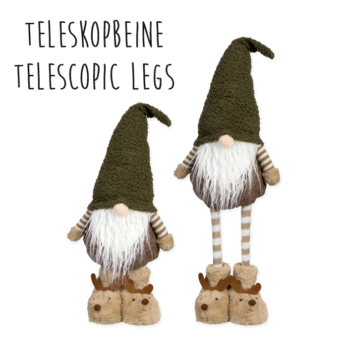 Dieser charmante Stoffwichtel bringt sofort gemütliche Stimmung in dein Zuhause – und das gleich in zwei Größen, je nach Laune. Dank seiner ausziehbaren Teleskopbeine wächst er nämlich ganz entspannt von ca 50cm auf bis zu 70cm und passt sich perfekt deiner Dekoration an.