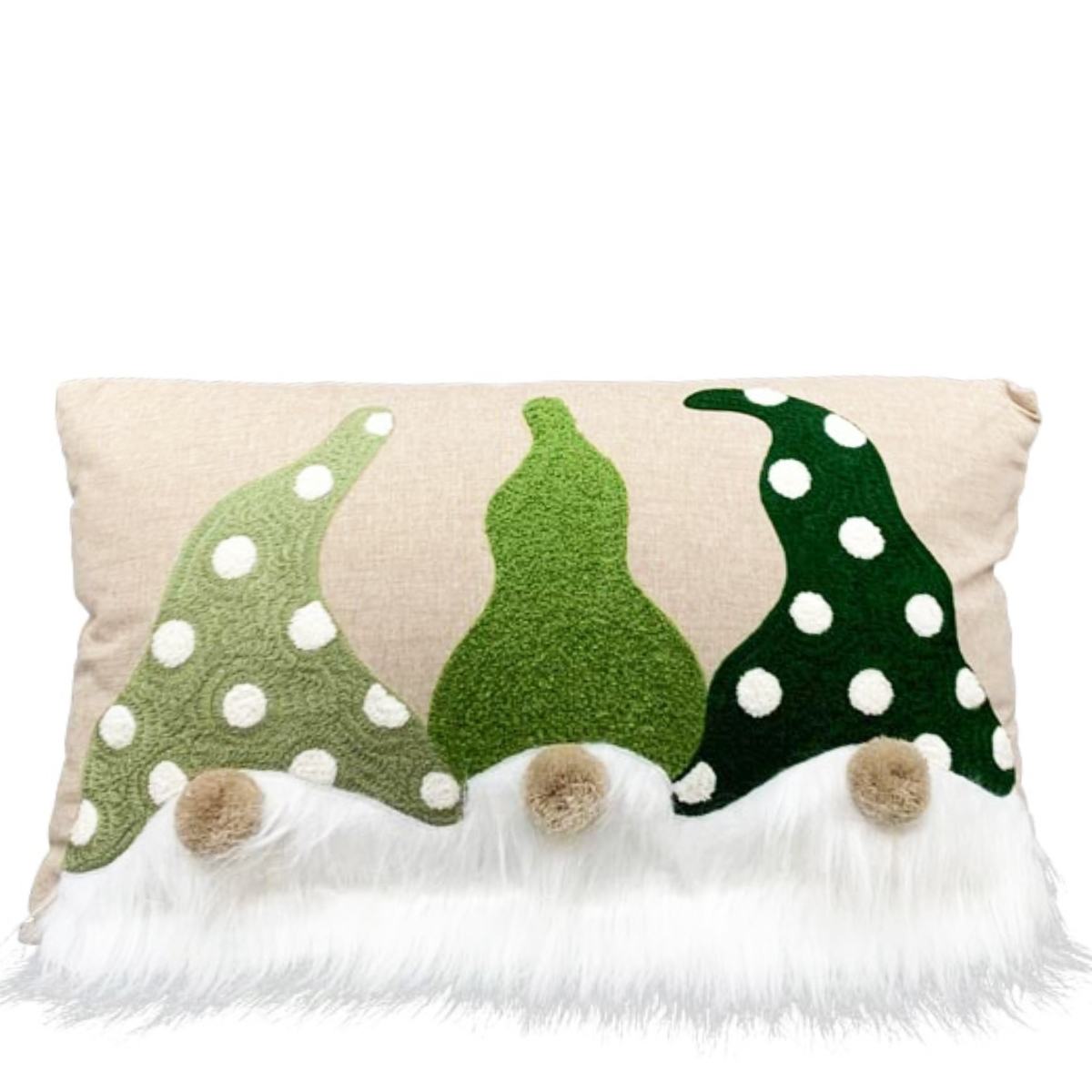 Die drei kleinen Weihnachtswichtel mit ihren grün gepunkteten Mützen, flauschigen Bärten und niedlichen Pommel-Nasen verleihen dem Kissen einen verspielten, charmanten Look.