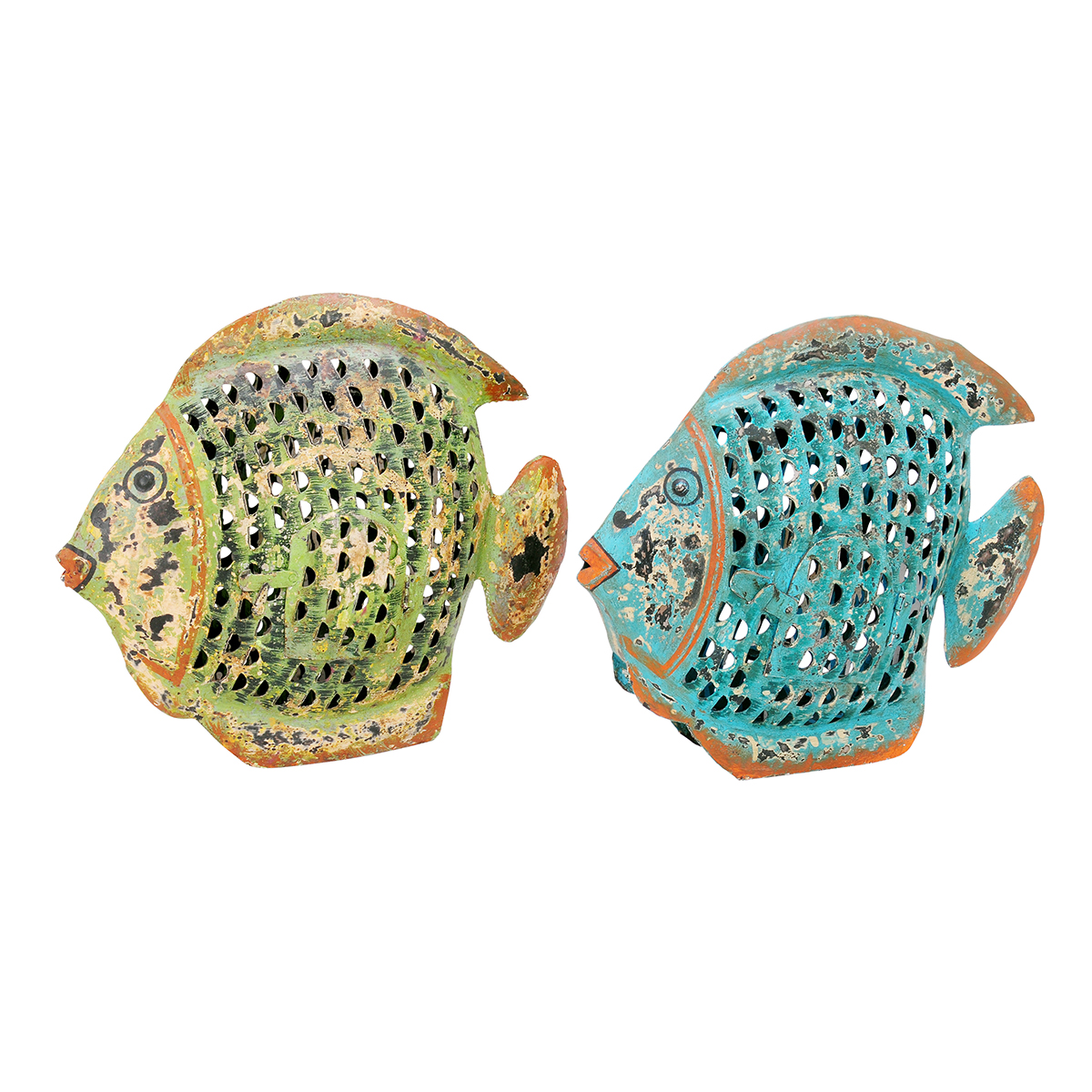 Deko Windlicht Fisch grün used look, Metallfisch mit kleinem Türchen, 31x24cm