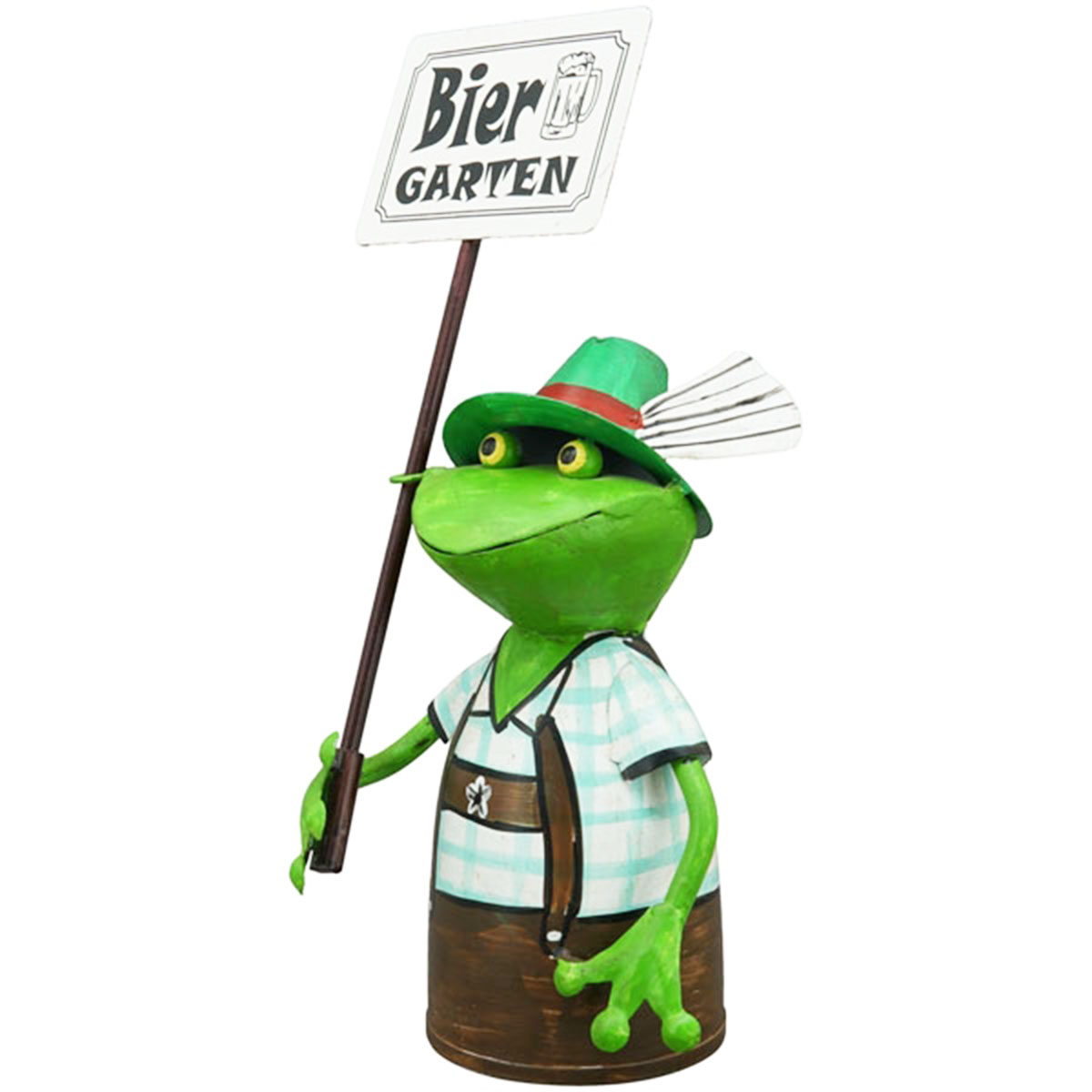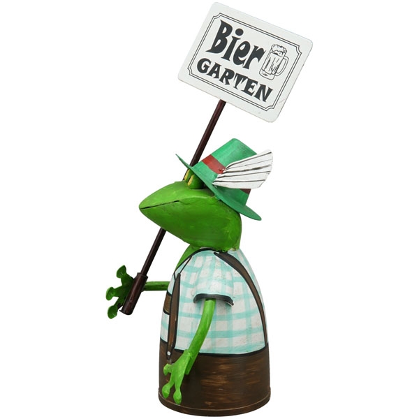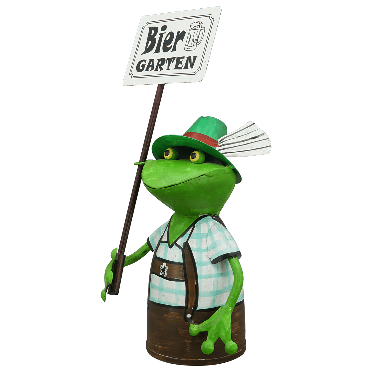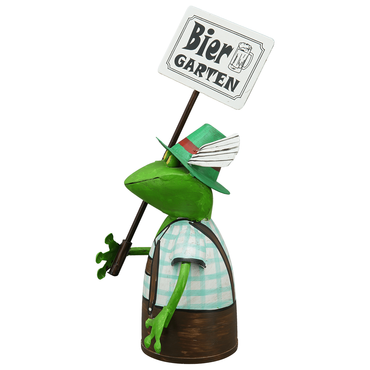 Zaunhocker Frosch Tracht, Metallfrosch in Lederhose mit Schild Biergarten, 30cm