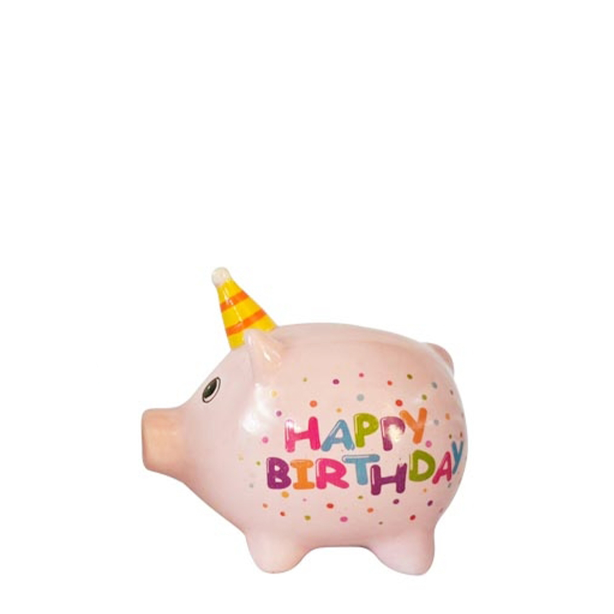 Kleine Spardose Party Schweinchen Happy Birthday, Sparschwein rosa mit Partyhut, Keramikspardose