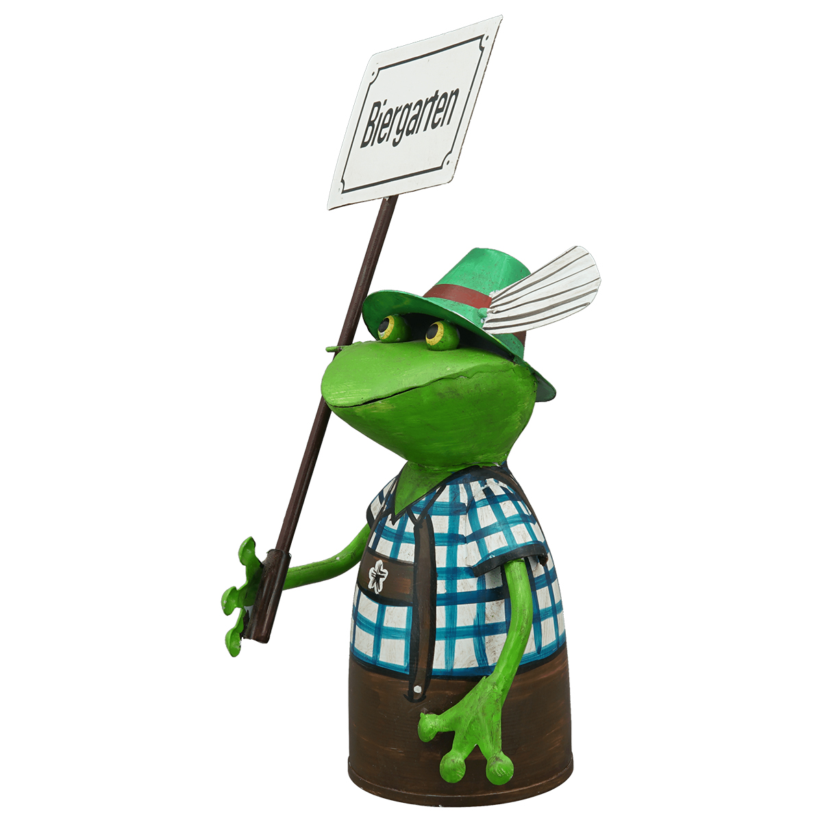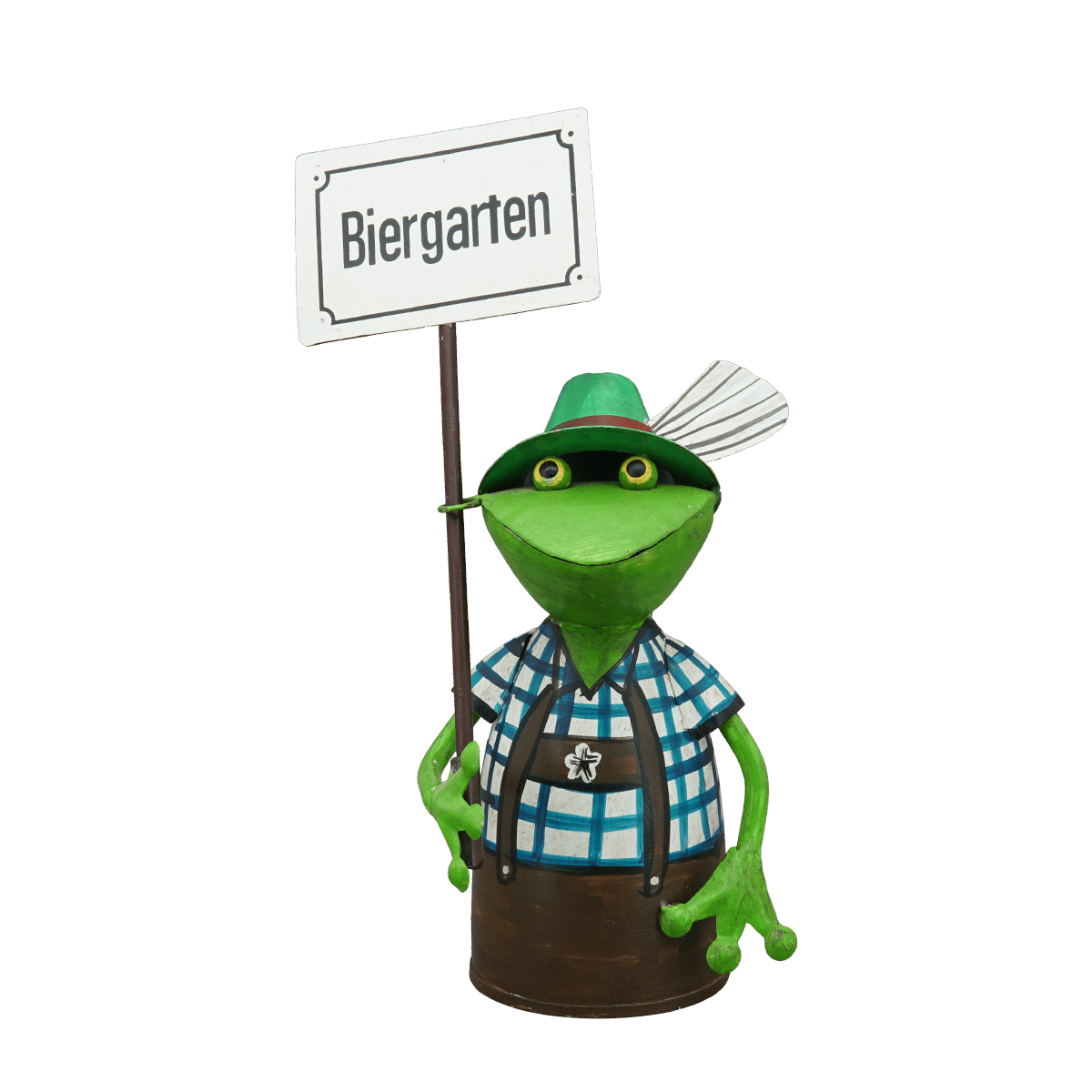 Produktinformationen "Zaunhocker Frosch Tracht, Metallfrosch in Lederhose mit Schild Biergarten, 30cm"