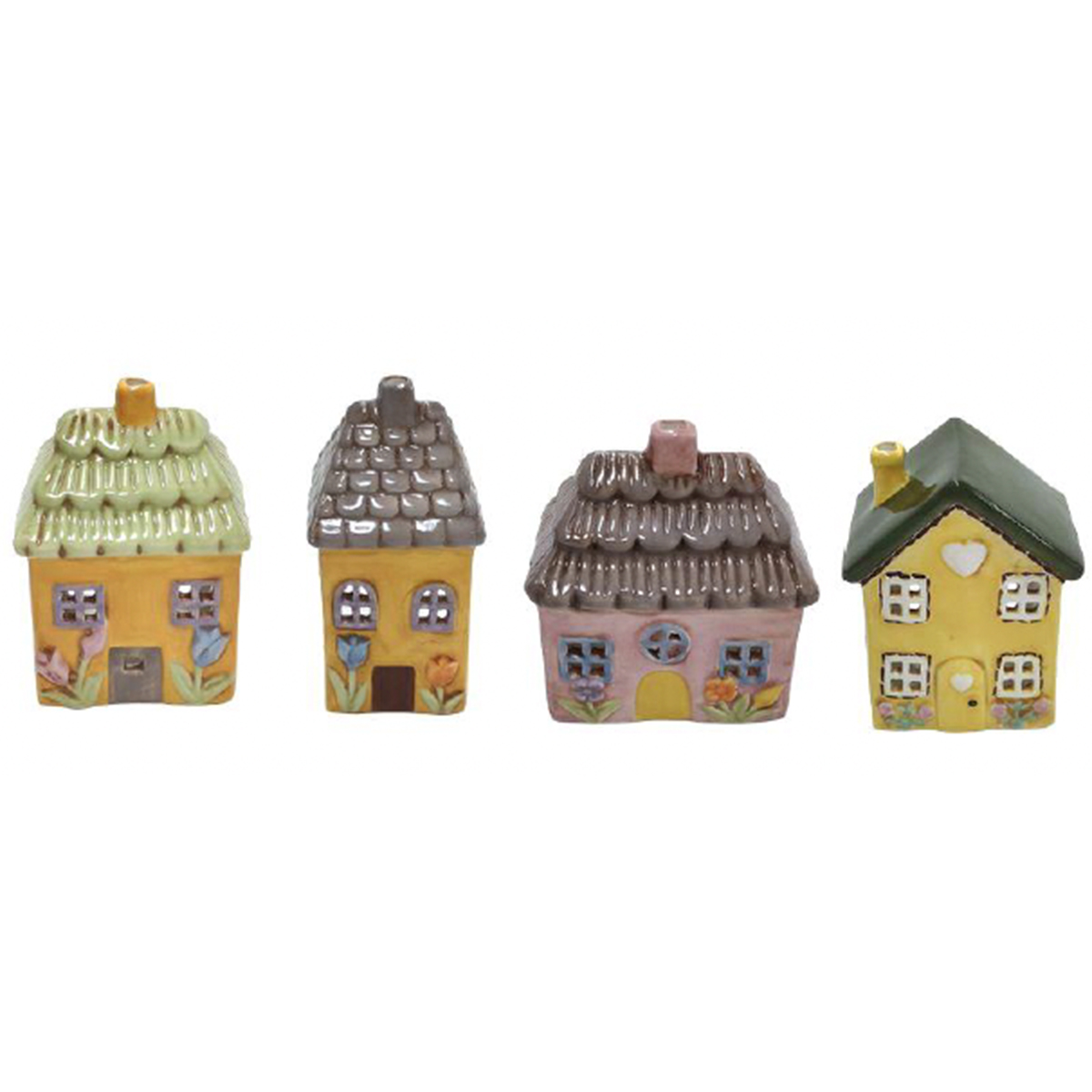 Dieses kleine, putzige Keramikhaus in warmem Gelb bringt sofort eine freundliche und verspielte Note in dein Zuhause. Die zarten Blumen neben Türen und Fenstern, das grüngraue Dach und die sanften Farbakzente verleihen dem Häuschen einen märchenhaften Charakter – fast wie ein winziges Zuhause aus einem idyllischem Landhausgarten.