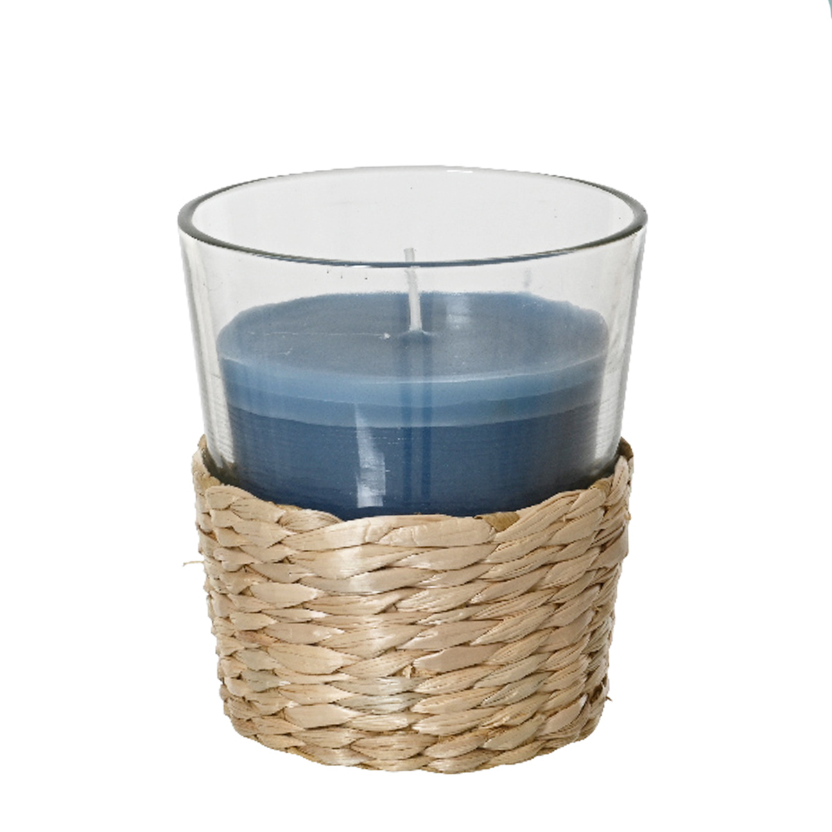 Duftkerze Citronella im Glas, Duftkerze blau im Bastkorb, outdoor, 7x7cm