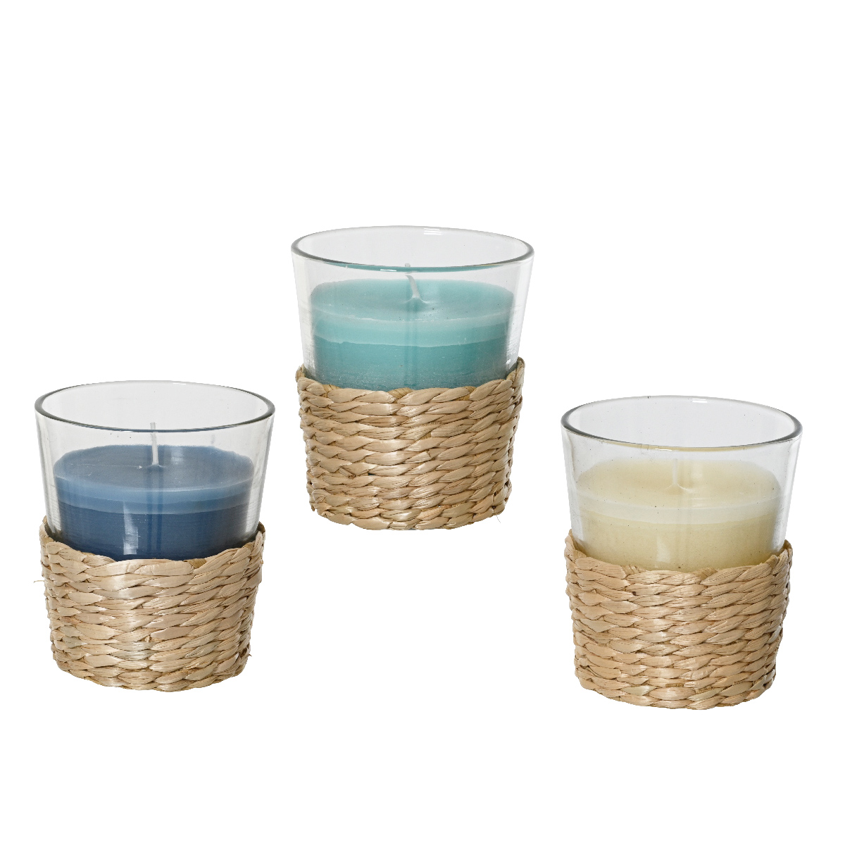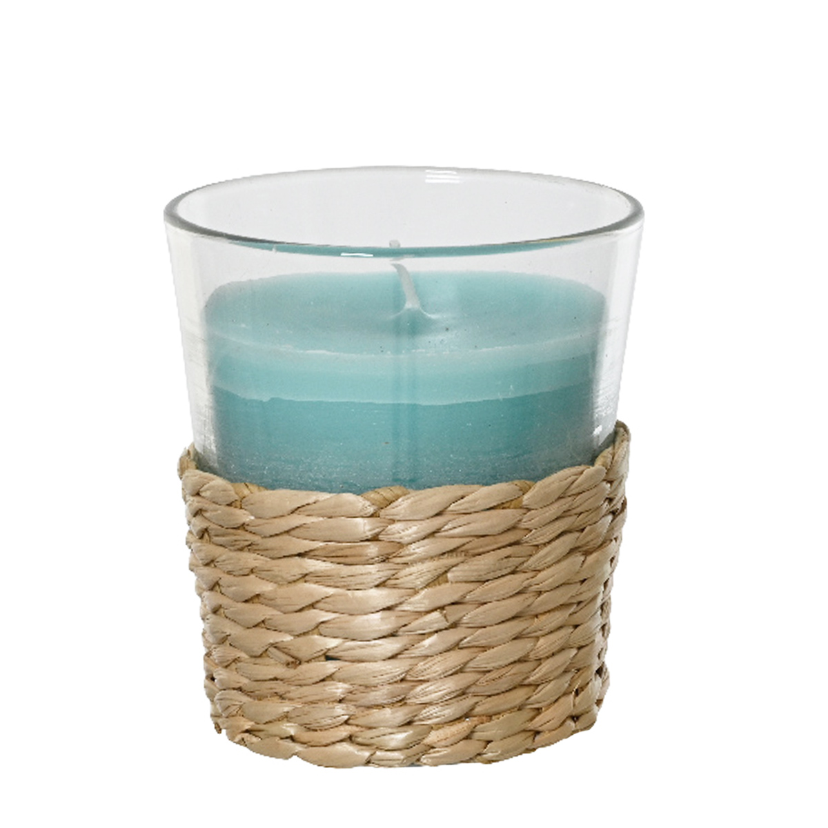 Duftkerze Citronella im Glas, Duftkerze türkis im Bastkorb, outdoor, 7x7cm