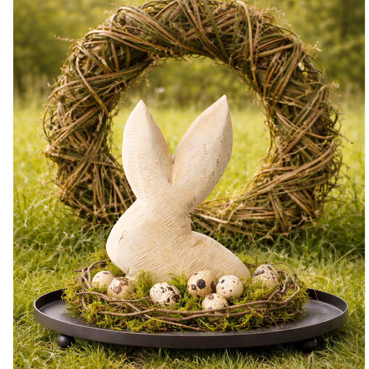 Durch seine zurückhaltende Größe fügt er sich leicht in bestehende Dekorationen ein und passt besonders gut zu anderen Holz- und Metallstücken im Landhaus- oder Chaletstil. Auch in Kombination mit den größeren Hasenfiguren oder Etageren aus der gleichen Serie entsteht ein harmonisches Gesamtbild.