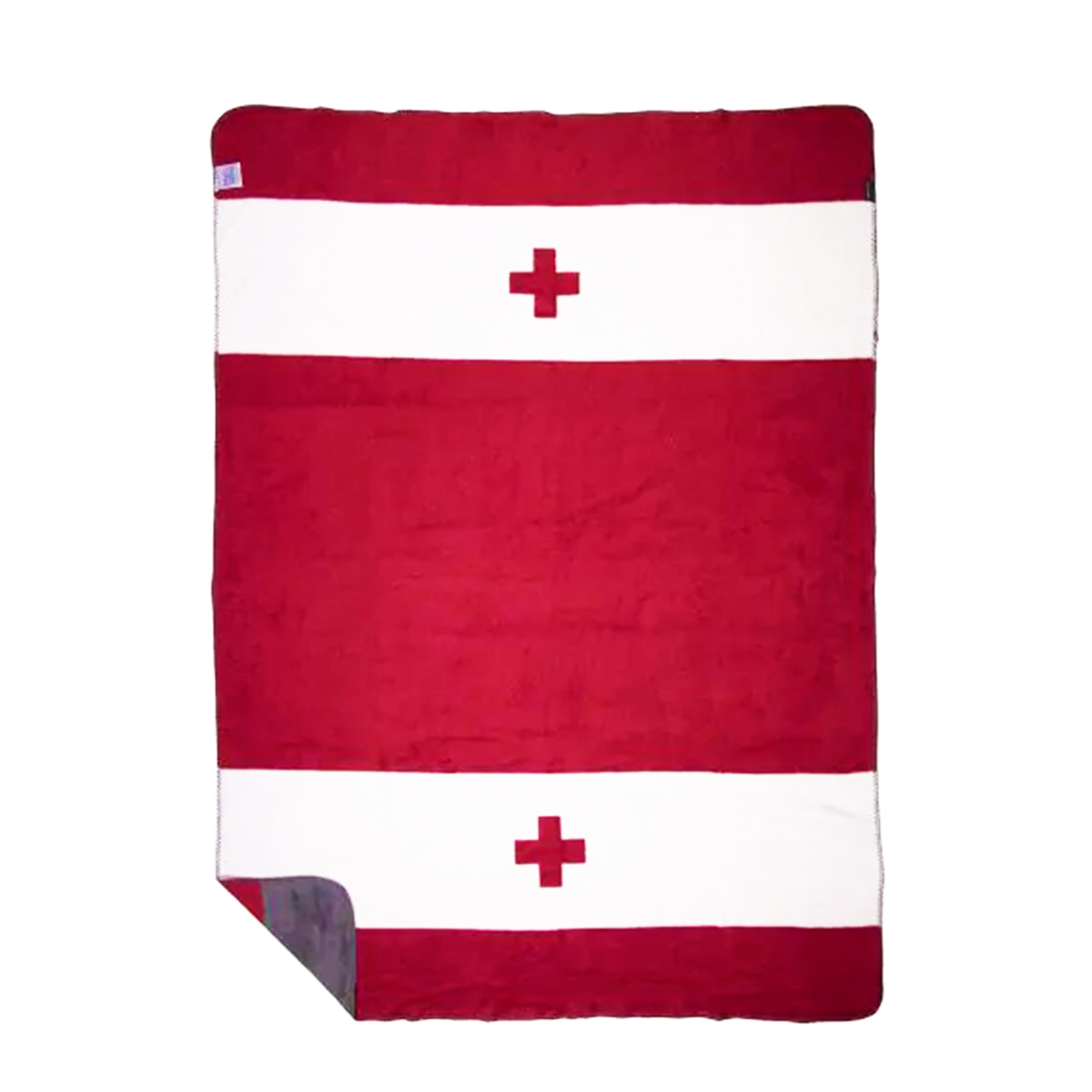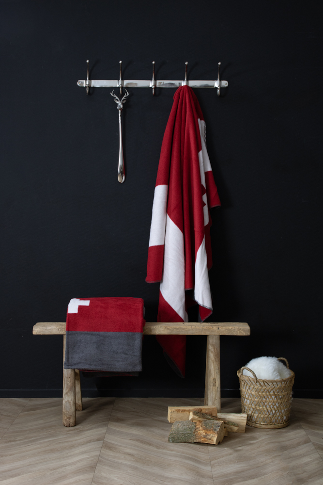 Die weiche Wendedecke zeigt auf beiden Seiten das klassische Schweizer Kreuz in kräftigem Rot und zeitlosem Grau und bringt damit ein alpines, heimeliges Gefühl in jedes Zuhause.