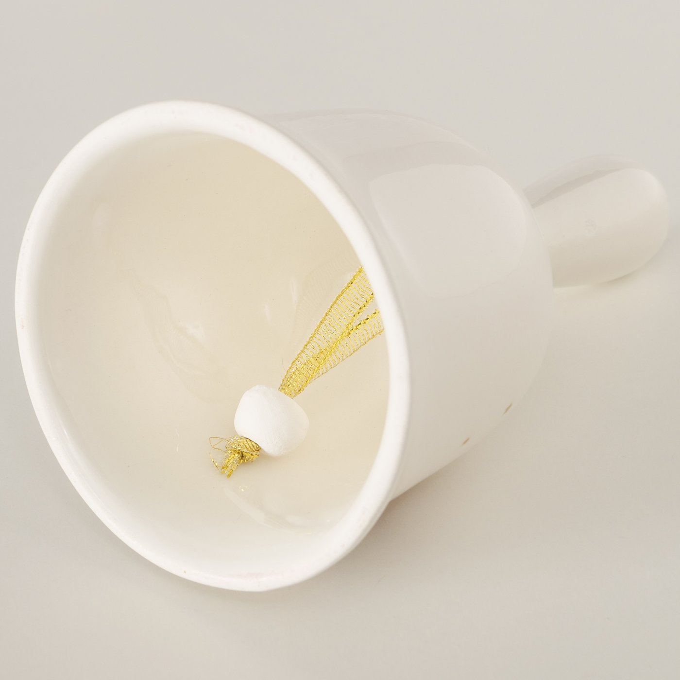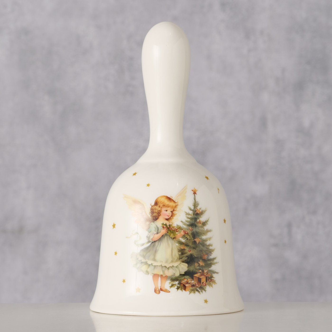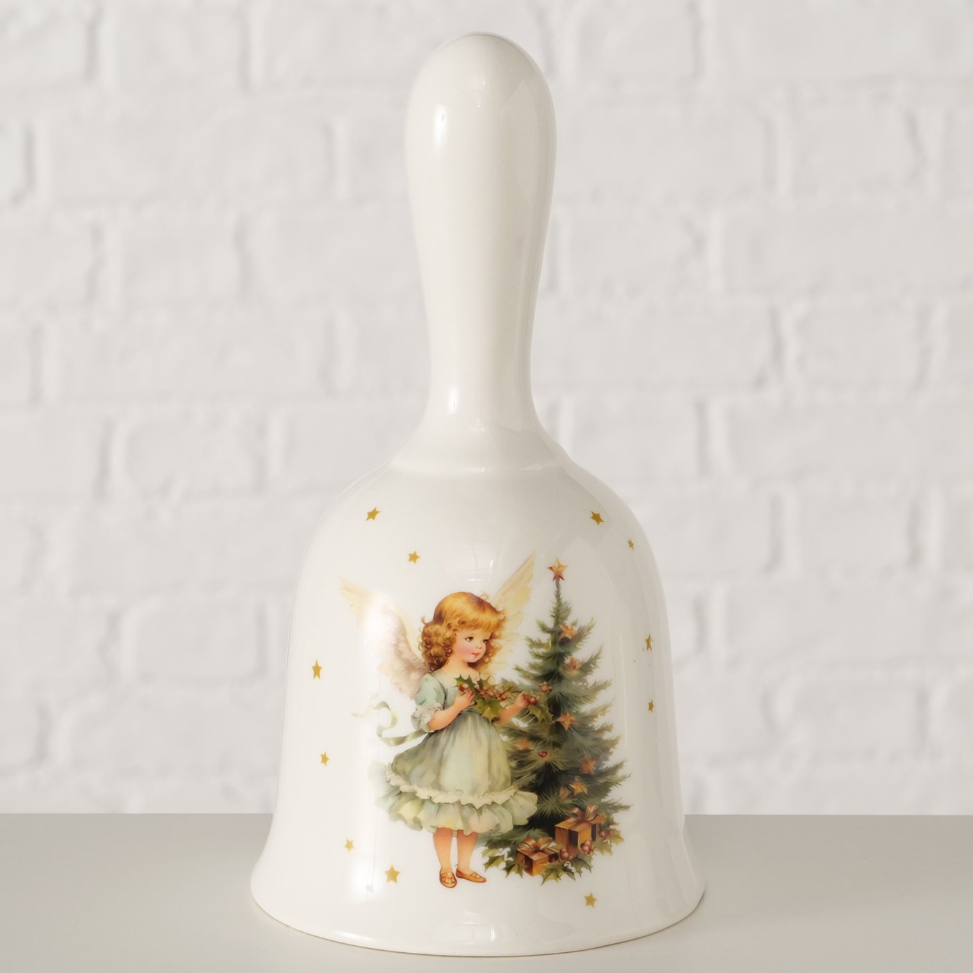 Das liebevolle Engelmotiv vor dem kleinen Tannenbaum erinnert an klassische Weihnachtsgeschichten und verleiht der Glocke ihren sanften, beinahe märchenhaften Charakter. Die glänzende Oberfläche in Cremeweiß mit feinen goldenen Sternen wirkt edel und zugleich zeitlos – perfekt für stilvolle Winterdekorationen.