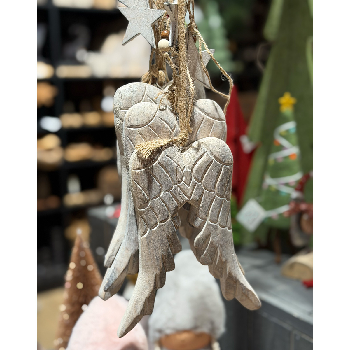 Die geschnitzten Engelsflügel in hellem Grau-Creme wirken rustikal und trotzdem weich – genau die Art von Weihnachtsdeko, die überall hineinpasst.