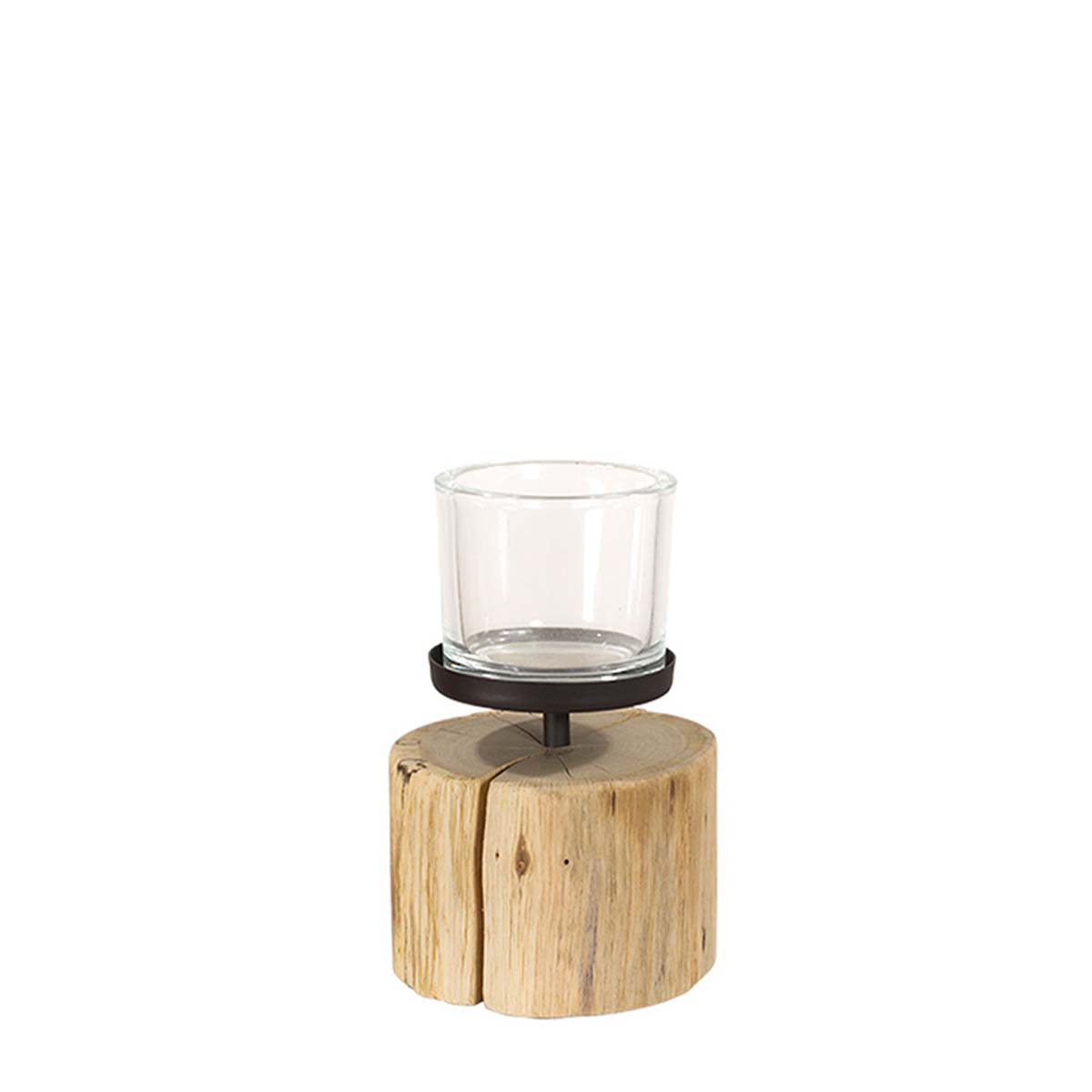Das klare Glas sitzt auf einem schlichten Metallhalter und bildet einen harmonischen Kontrast zum robusten Holz. Durch die reduzierte Form passt der Kerzenständer in moderne, rustikale oder alpenländische Einrichtungen gleichermaßen.