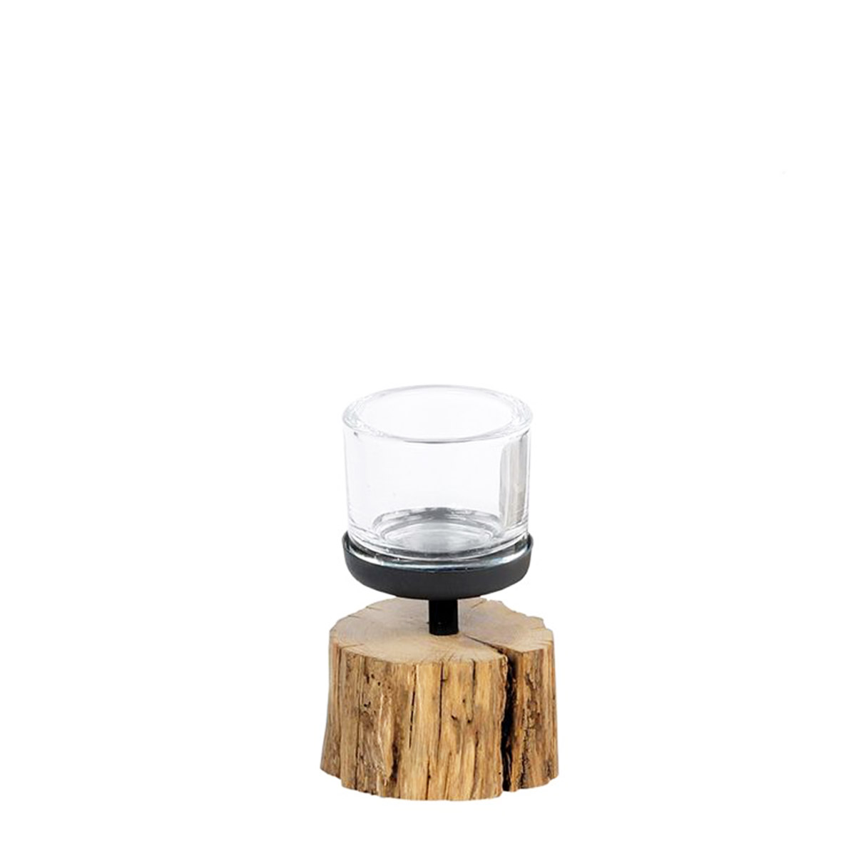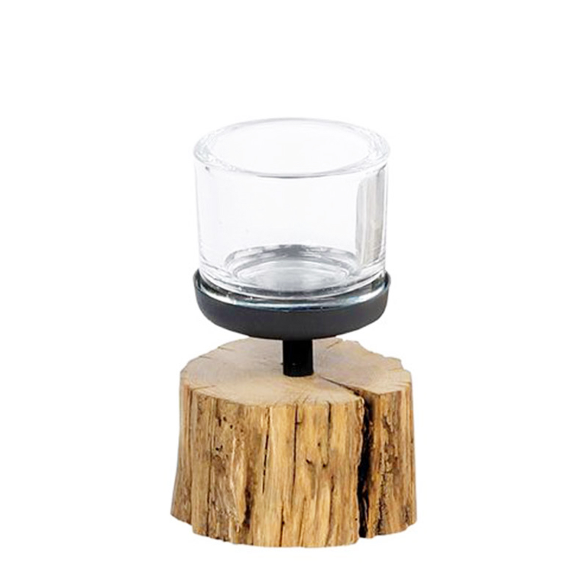 Ein natürliches Windlicht mit besonderem Charme, das durch die Kombination aus rustikalem Naturholz und klarem Glas für eine warme, gemütliche Stimmung sorgt.
