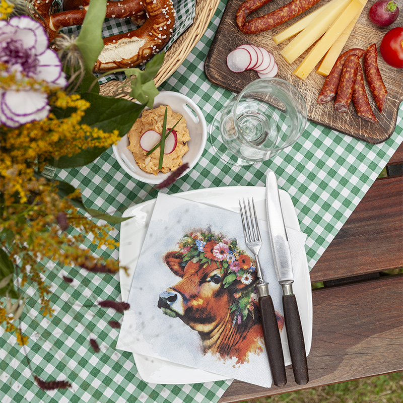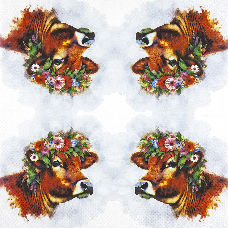Herstellerinformationen zu "Home Fashion Papierservietten Heimat, Alpenkuh mit Blumenkranz Muh!, 33x33cm"