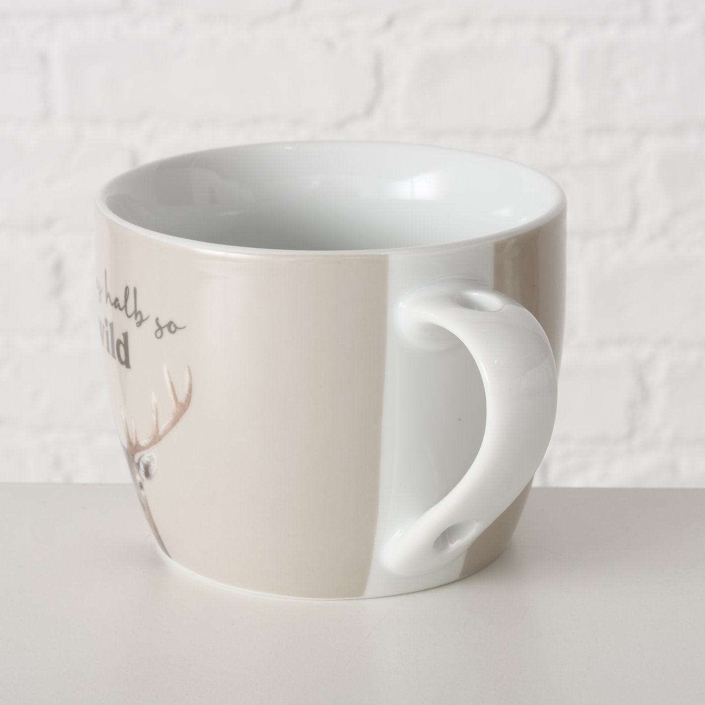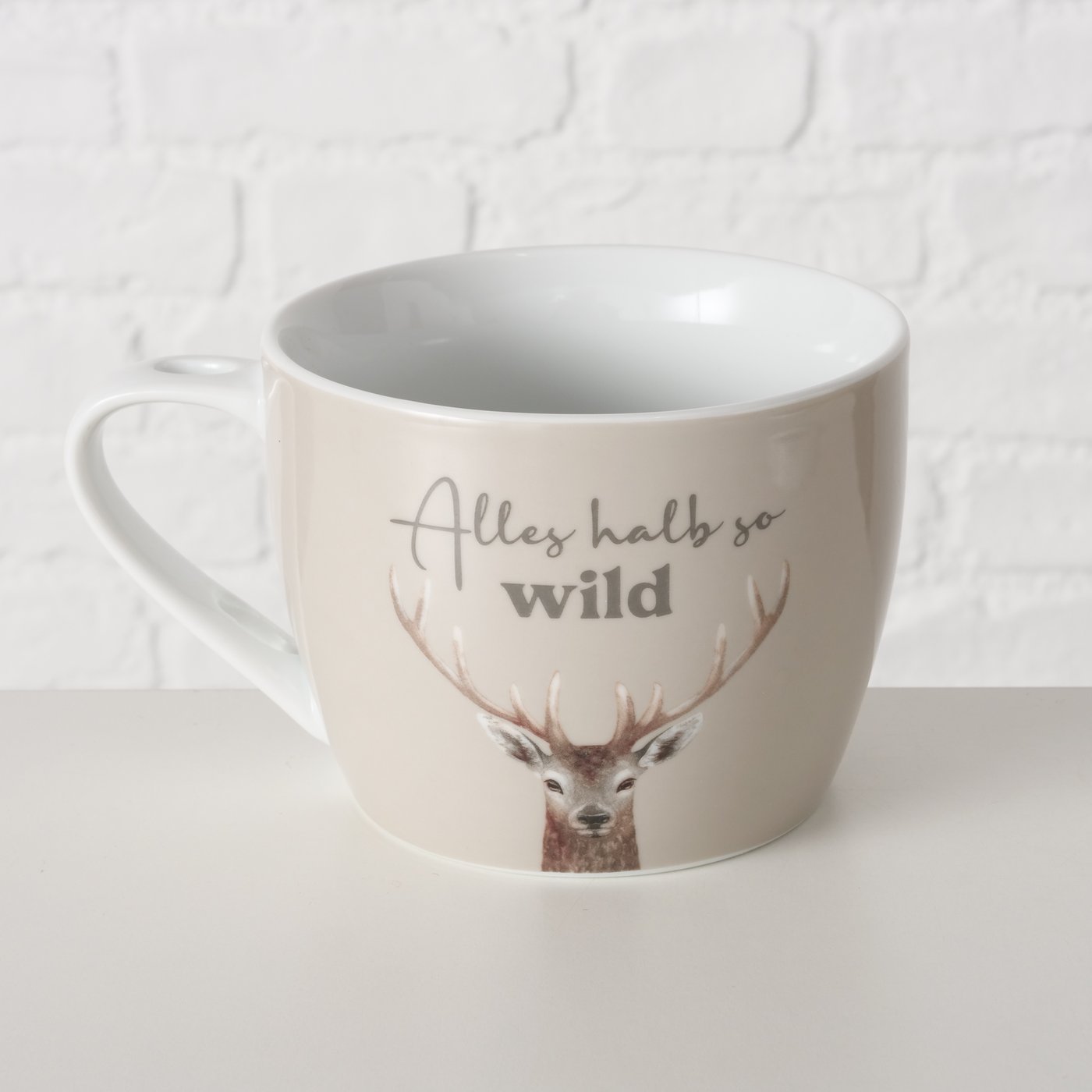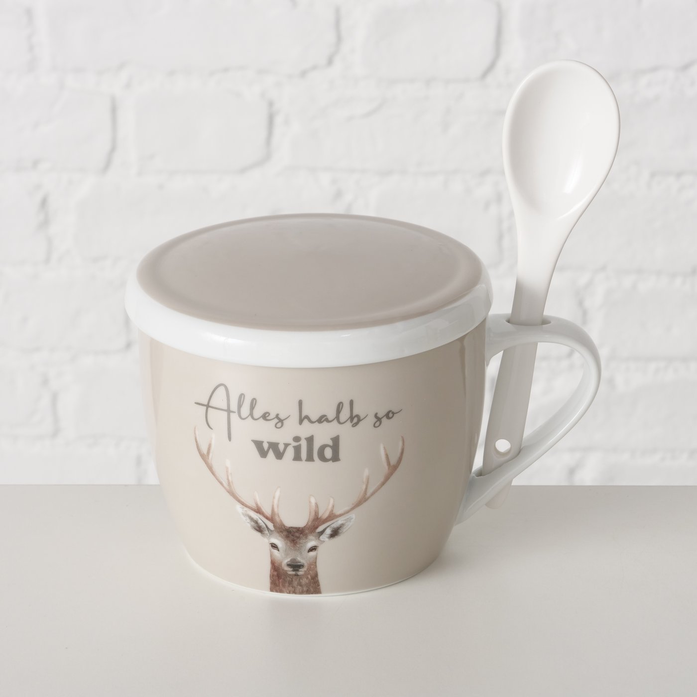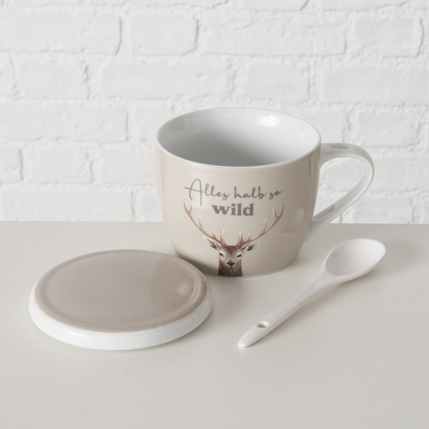 Jumbobecher Hirsch, Porzellanbecher mit Henkel, Deckel und Löffel, Alles halb so wild, Boltze Home Collections
