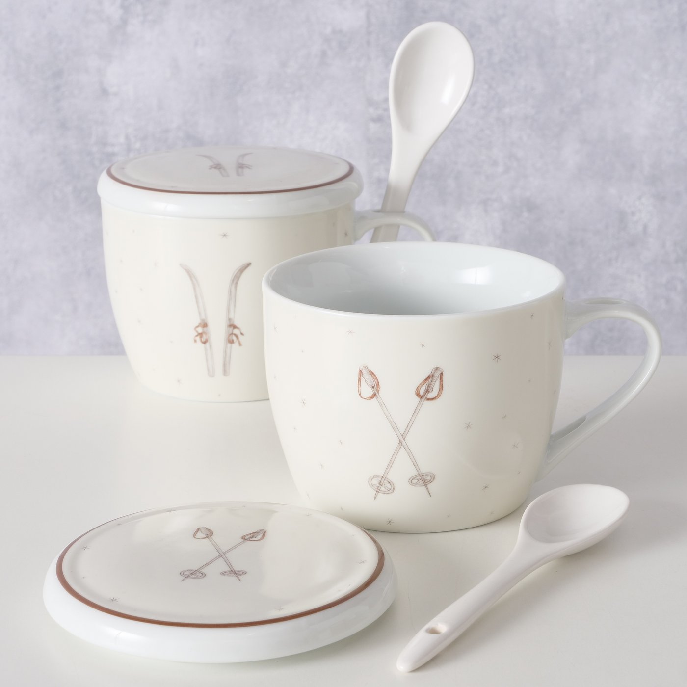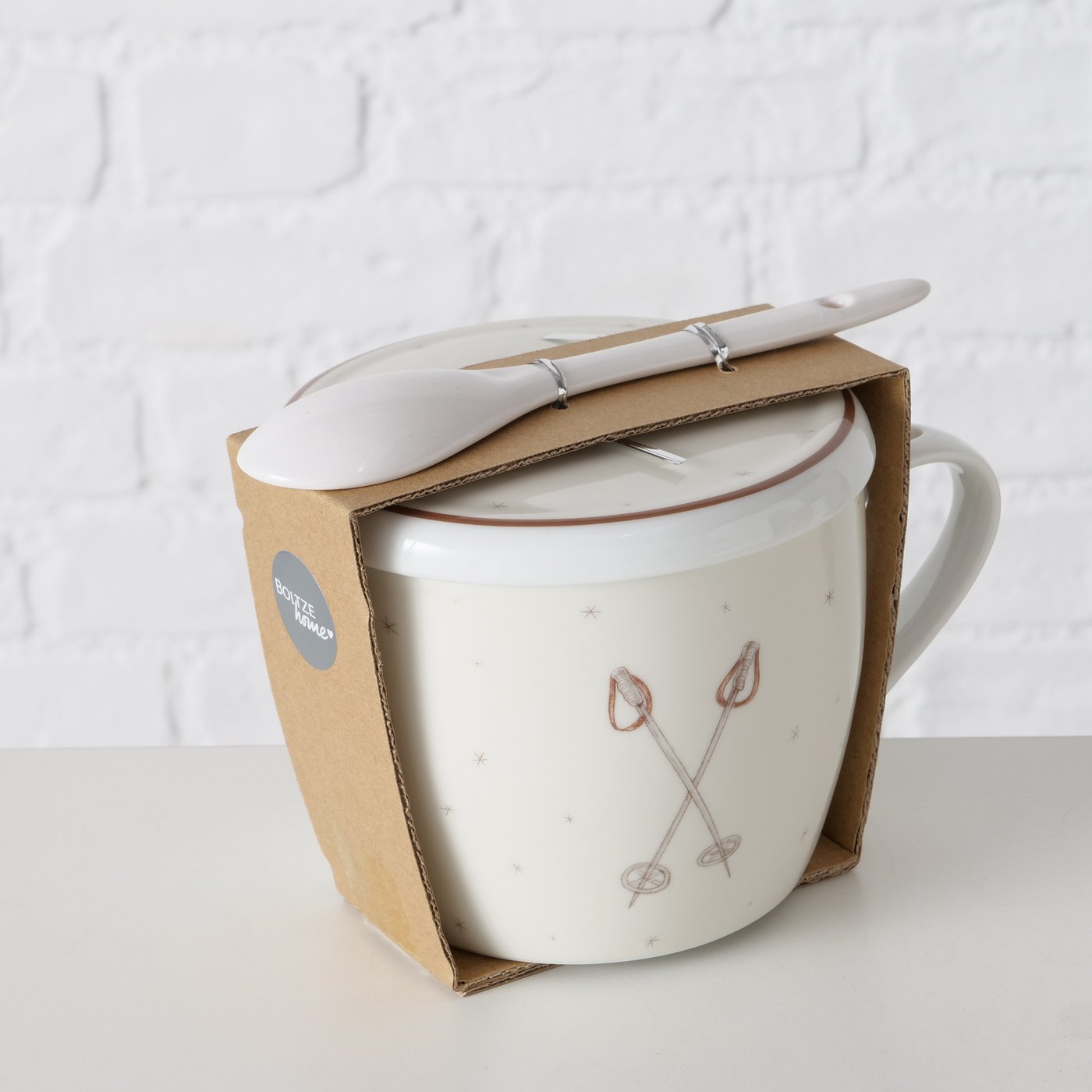 Jumbobecher Mountains Skistöcke, Henkelbecher mit Löffel und Deckel, 600ml, Boltze Home Collections