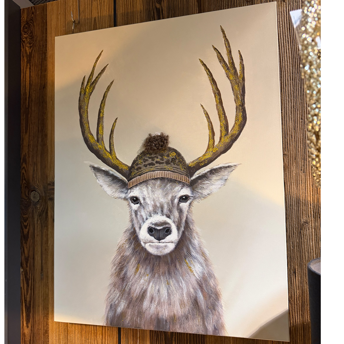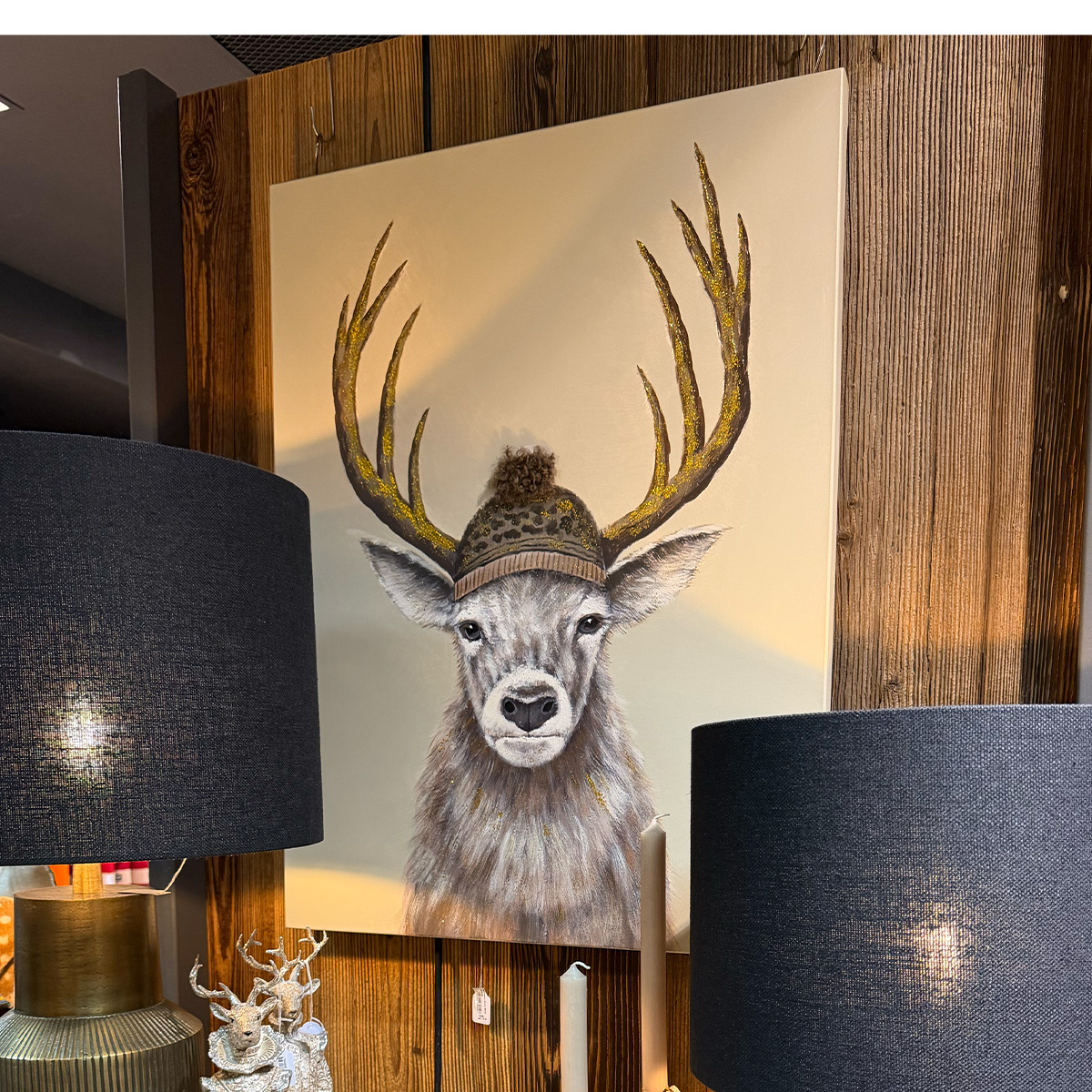 Dieses liebevoll gestaltete Leinwandbild zeigt einen majestätischen Hirsch, der mit seiner warmen Pudelmütze sofort winterliche Gemütlichkeit verbreitet. Die sanften Brauntöne, kombiniert mit feinen Details im Fell und im Geweih, machen dieses Motiv zu einem echten Hingucker – egal ob im Wohnzimmer, Eingangsbereich, Chalet oder in einer modernen Alpen- und Landhaus-Einrichtung.