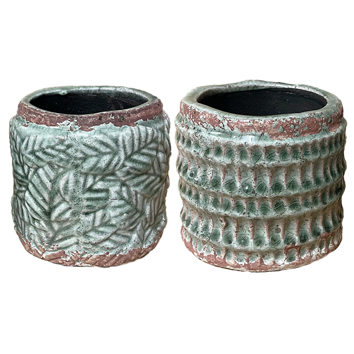 Keramik Pflanztopf Blätter Relief, Übertopf grün-terra, 11x10cm