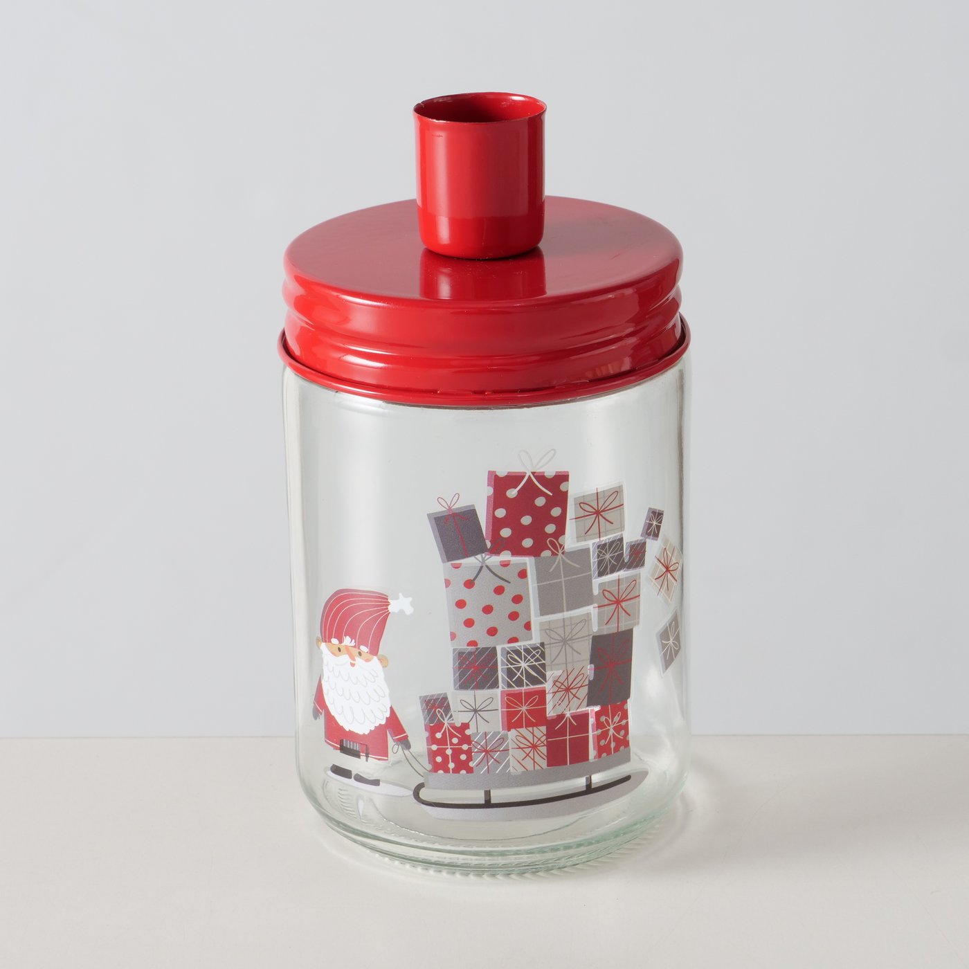 Produktinformationen "Kerzenglas Weihnachtsmann, Kerzenhalter rot, mit Schlitten und Geschenke, Boltze Home Collections"