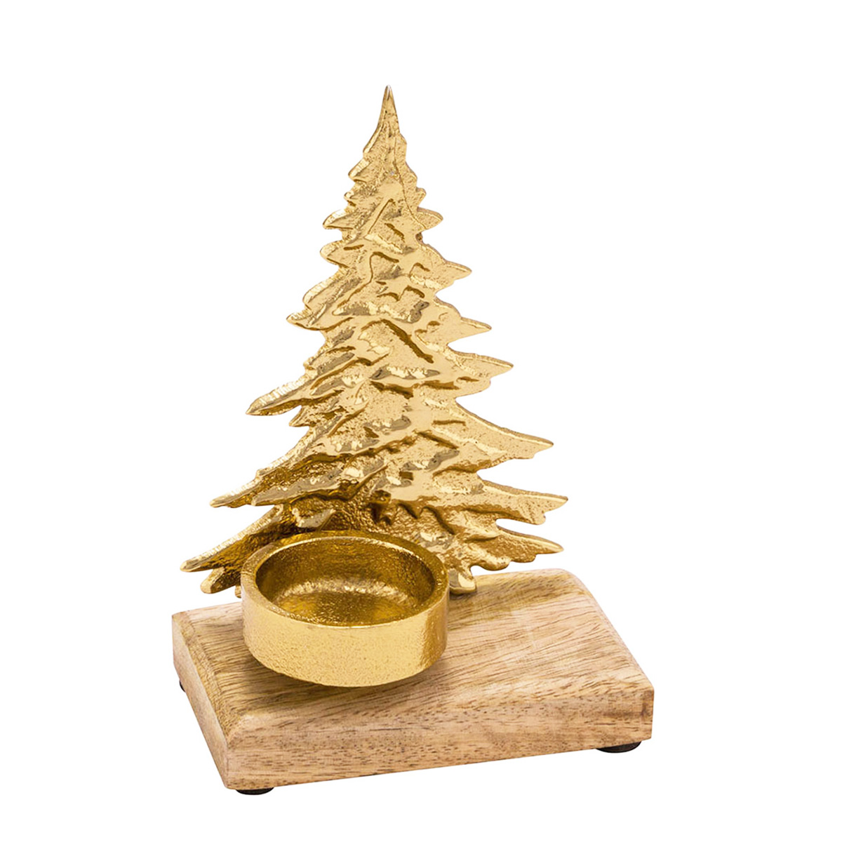 Kerzenhalter Tannenbaum, Holztablett mit Teelichthalter, Tannenbaum gold, 15cm