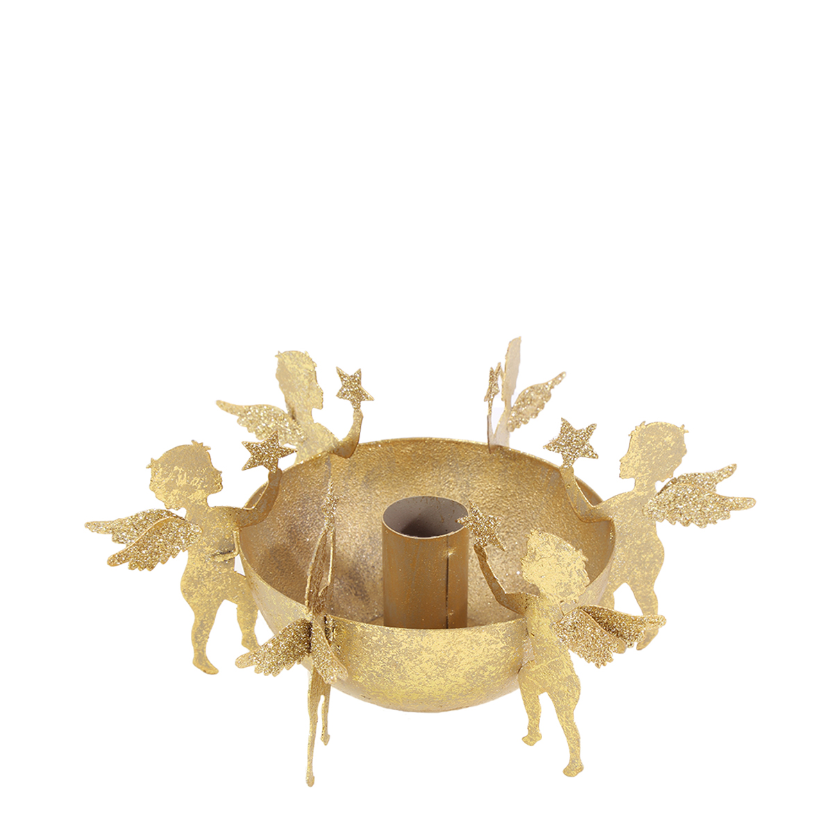 Produktinformationen "Kerzenständer Engel, Kerzenschale Engel mit Sterne, Metallschale mit Stabkerzenhalter gold used look"