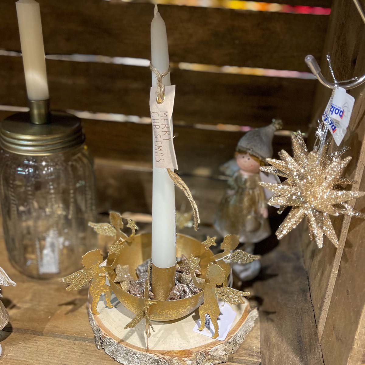 Die goldene Metallschale ist rundum mit kleinen Engeln verziert, die zarte Sterne in den Händen halten und eine warme, festliche Atmosphäre schaffen. Der unregelmäßige used look verleiht dem Kerzenhalter eine besonders charmante, leicht nostalgische Ausstrahlung – wie aus einer liebevoll geschmückten Winterstube.