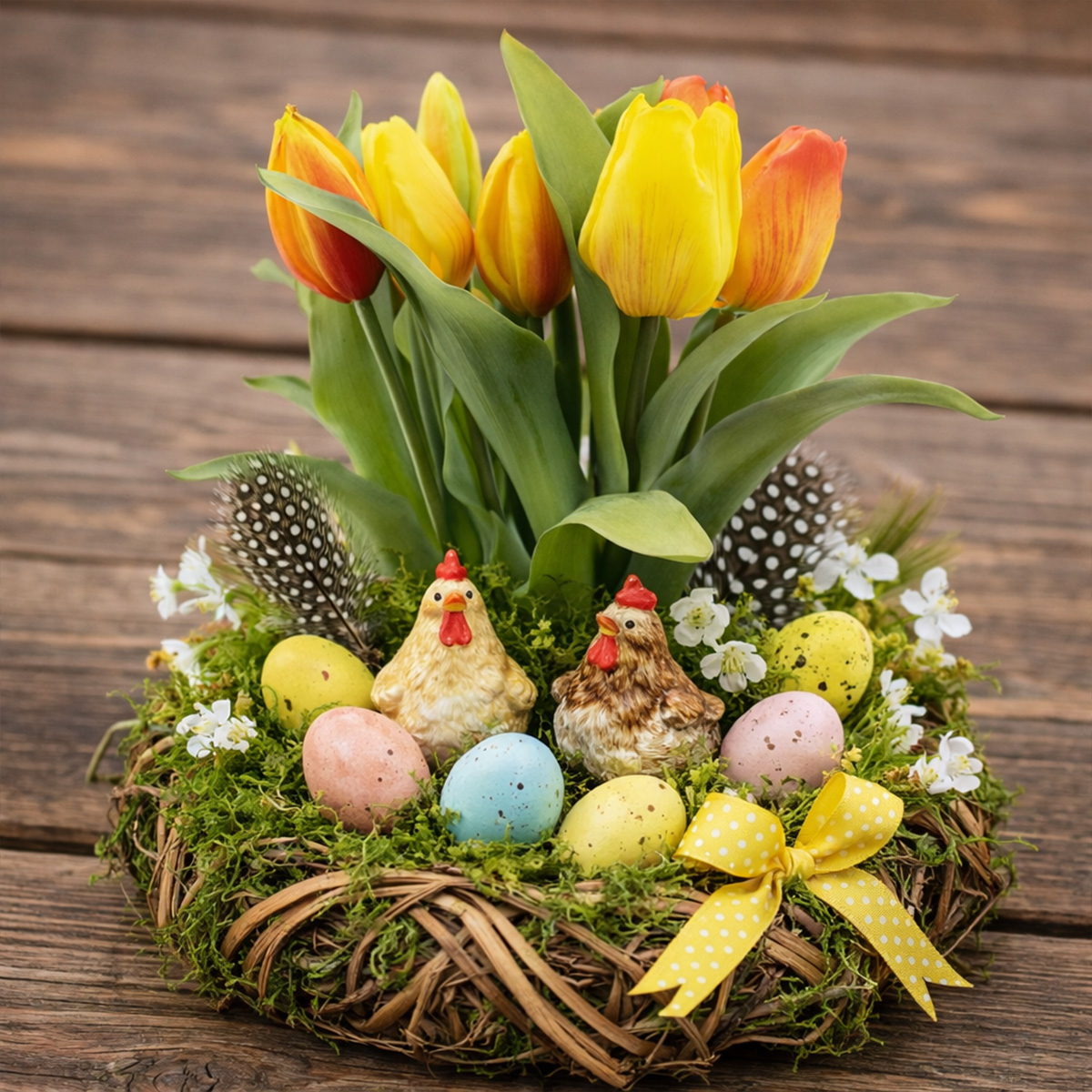 Die sieben liebevoll gestalteten Tulpen wirken wie frisch gepflückt und überzeugen durch ihre harmonische Farbverläufe, die sanft geschlossenen Blüten und das natürlich gearbeitete Blattwerk. Die Kombination aus sonnigem Gelb und warmem Orange sorgt für eine freundliche, positive Ausstrahlung.