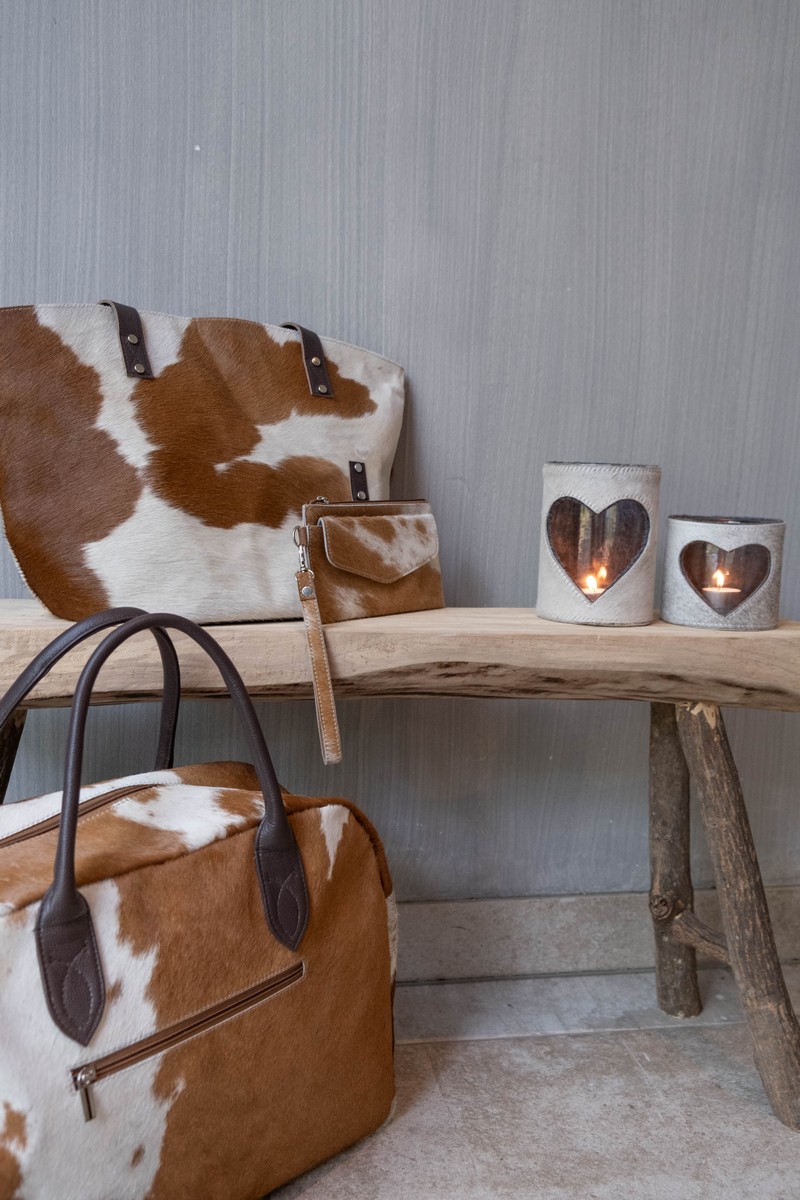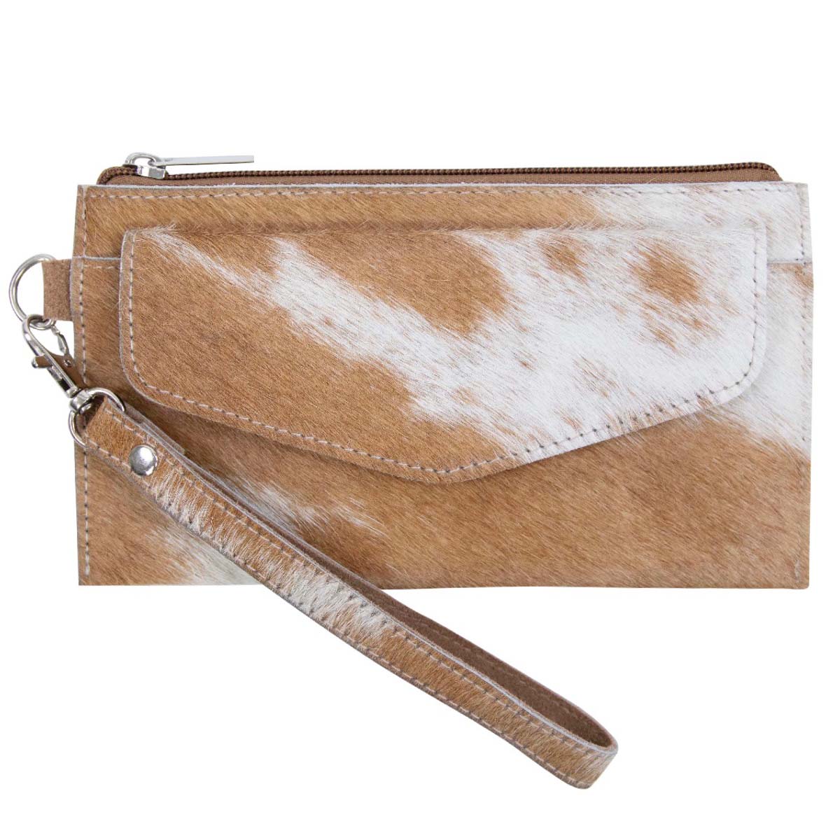 Kuhfell Mäppchen mit Außenfach, Geldbörse mit Handschlaufe braun-weiß, 20x11cm, Mars & More
