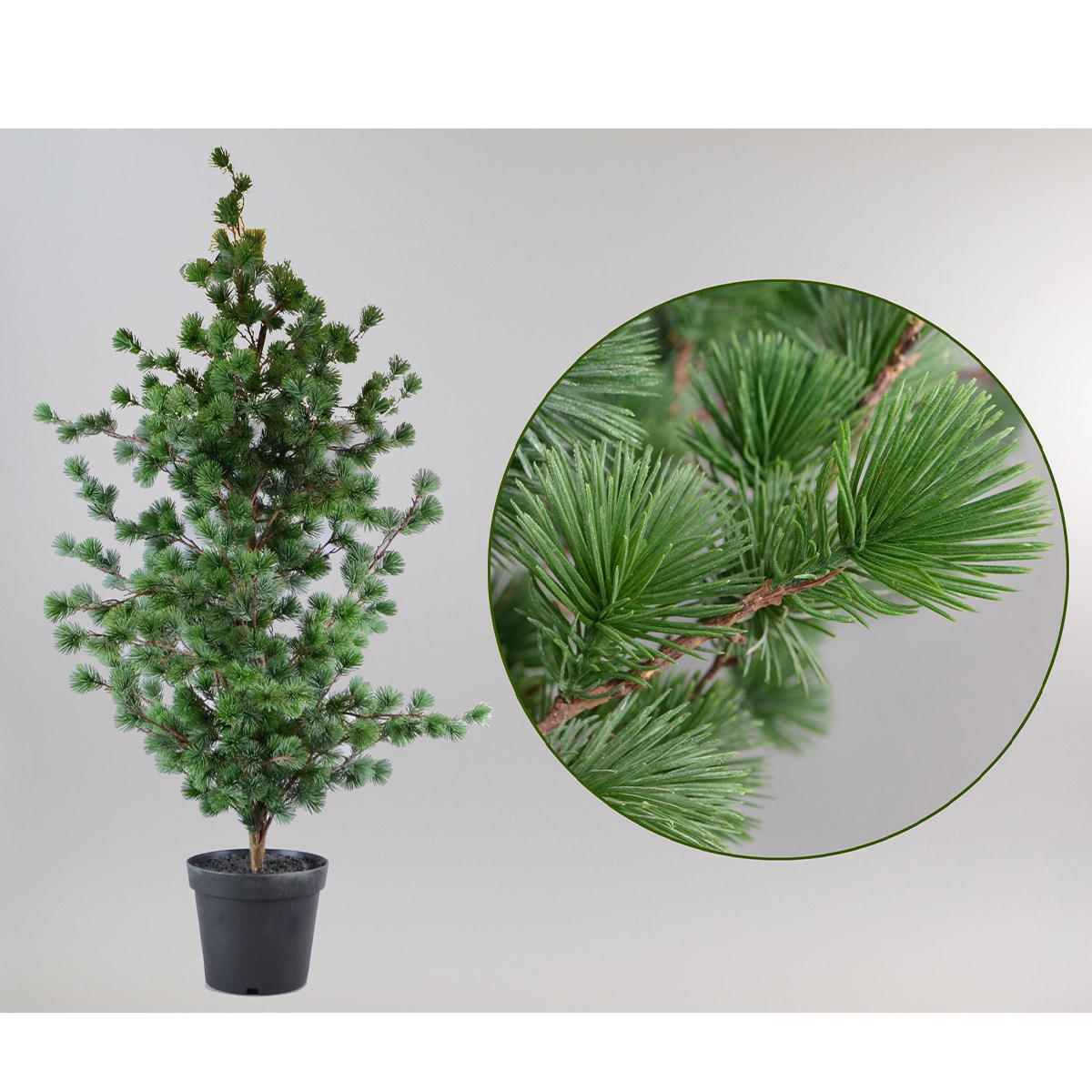 Mit seinen detailreichen, unterschiedlich langen Nadeln und den fein verzweigten Ästen wirkt er täuschend echt und sorgt für eine ruhige, natürliche Atmosphäre. Der Baum steht fest in einem schlichten schwarzen Topf und kann direkt dekoriert oder in einen Übertopf gestellt werden.