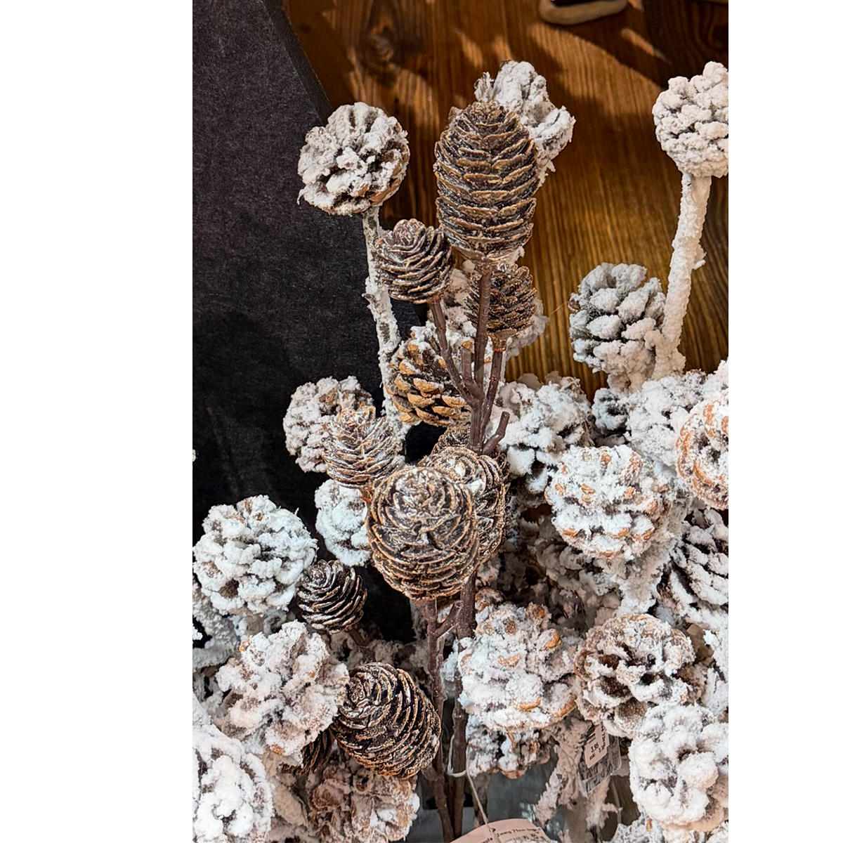 Dieser beschneite Kiefernzapfen-Zweig bringt winterliche Ruhe und natürliche Eleganz in jede Dekoration.