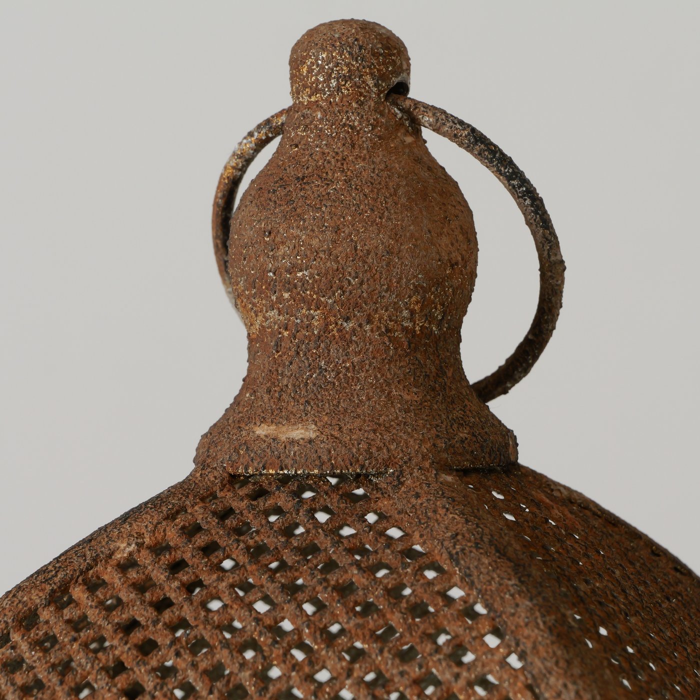 Die handgearbeitete Laterne überzeugt durch ihre markante Rostoptik in antikem Braun und das fein gearbeitete Gitterdach, das für ein besonders stimmungsvolles Lichtspiel sorgt. Sobald eine Kerze im Inneren brennt, entstehen durch die Cut-Out-Struktur sanfte Lichtpunkte, die eine warme und ruhige Atmosphäre schaffen.