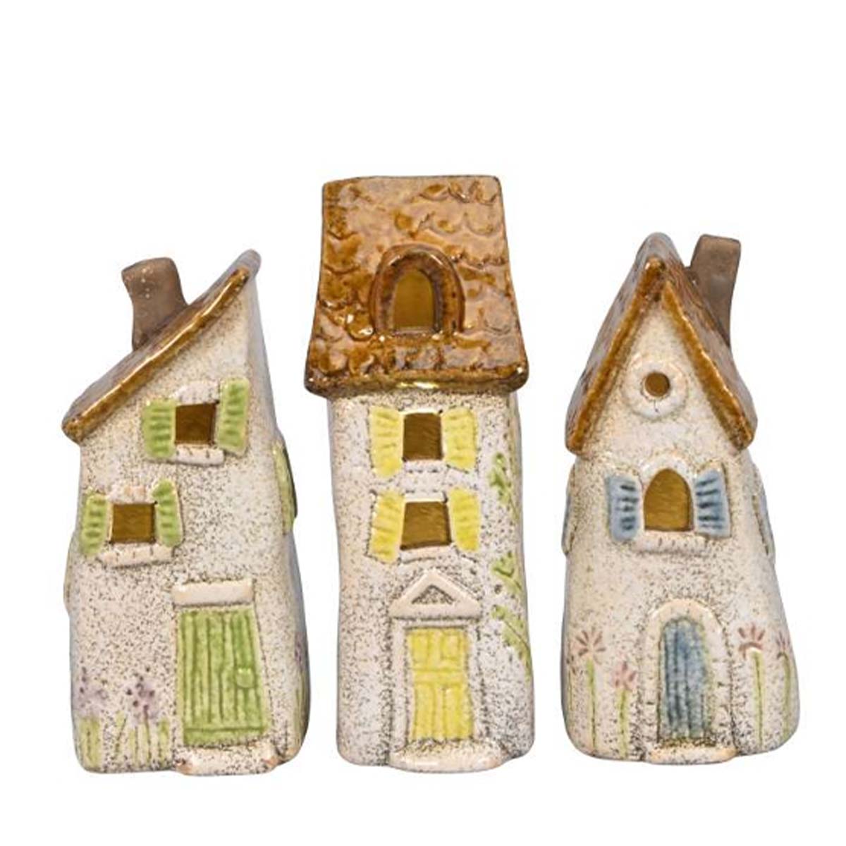 Diese kleinen, windschiefen Keramikhäuser wirken wie aus einem Märchendorf und bringen sofort eine warme, gemütliche Stimmung in Ihr Zuhause. Die liebevoll gestalteten Details, die zarten Pastellfarben und die leicht schiefen Formen verleihen jedem Haus einen ganz eigenen Charakter, sodass sie sowohl einzeln als auch als kleine Häusergruppe besonders dekorativ wirken.