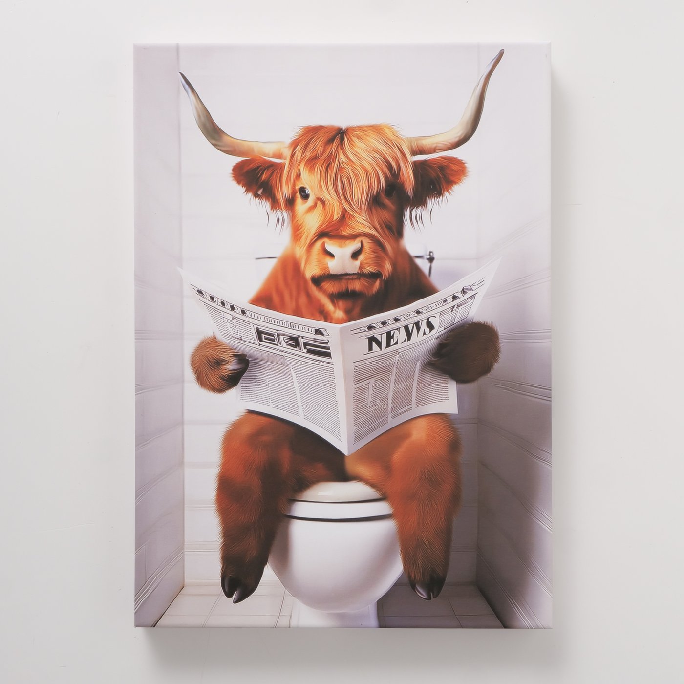 Leinwandbild lustiges Hochlandrind Lumpi beim Zeitungslesen, Stier auf Toilette, 50x70cm
