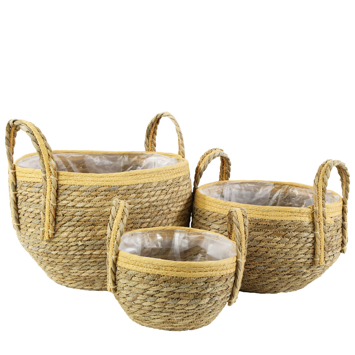 Produktinformationen "Pflanzkorb Seegras natur-helles orange, Übertopf mit Henkel, Naturkorb mit Folie ausgekleidet, 15x20"