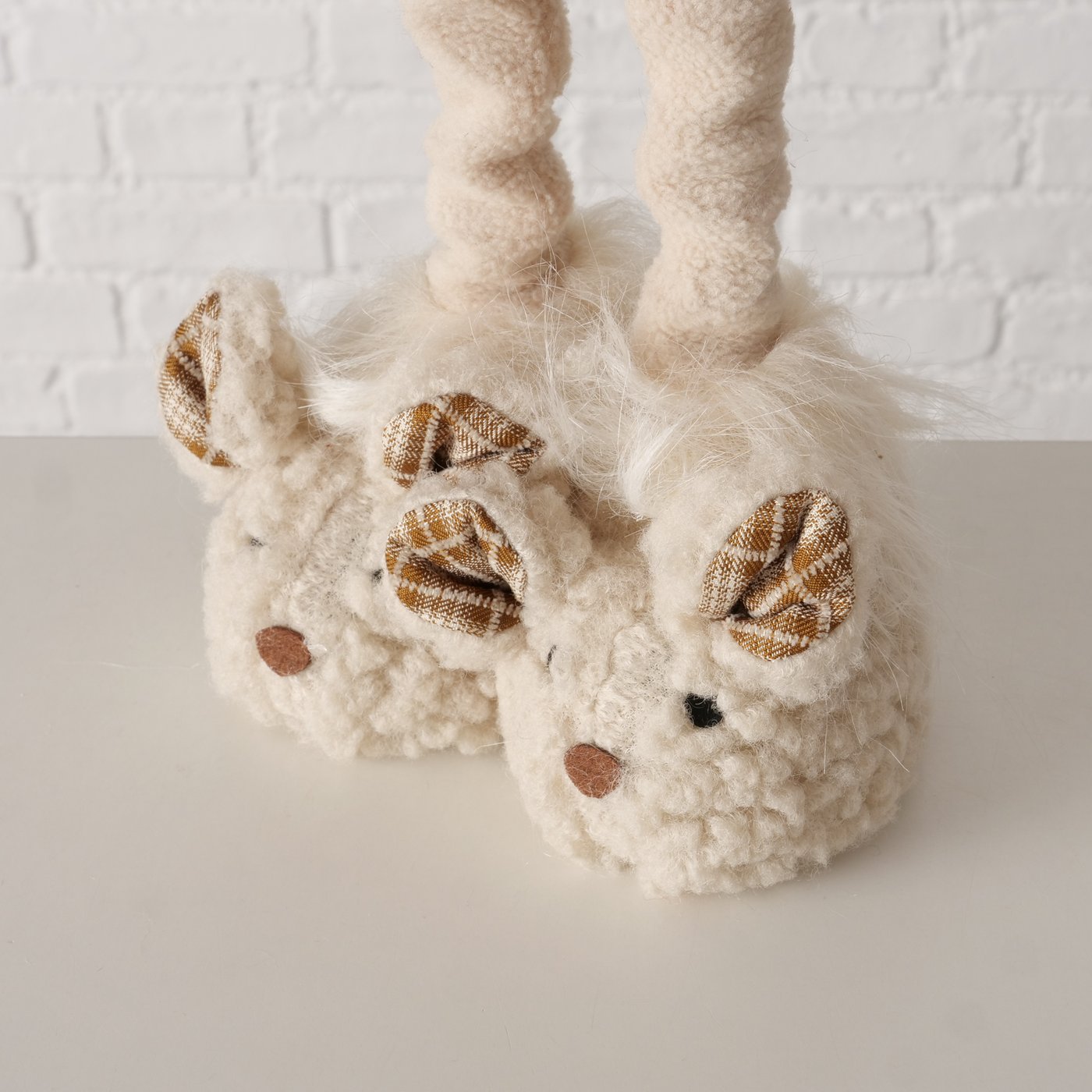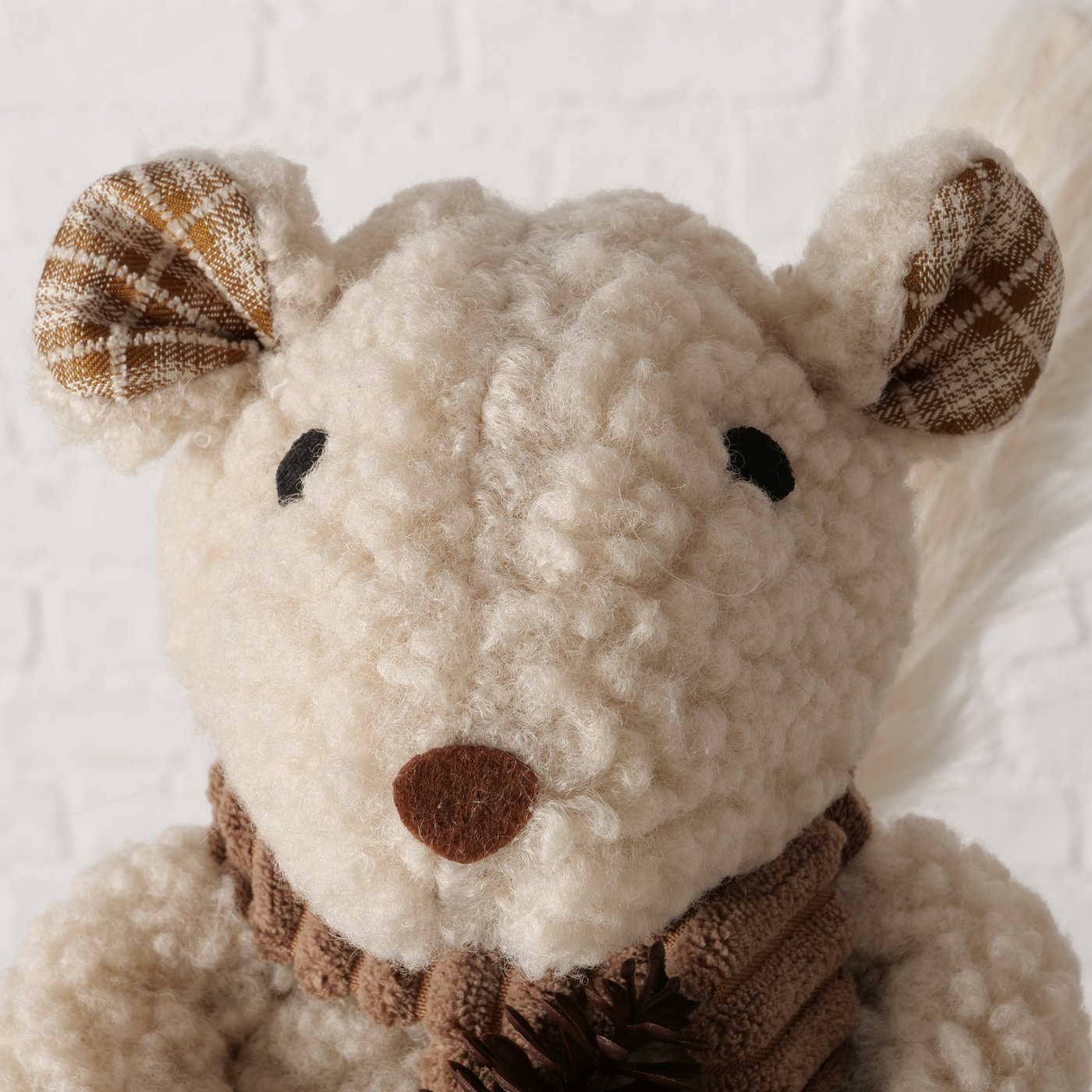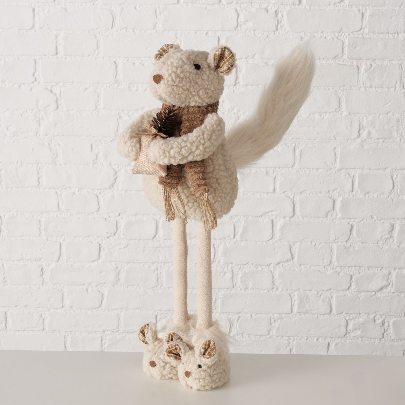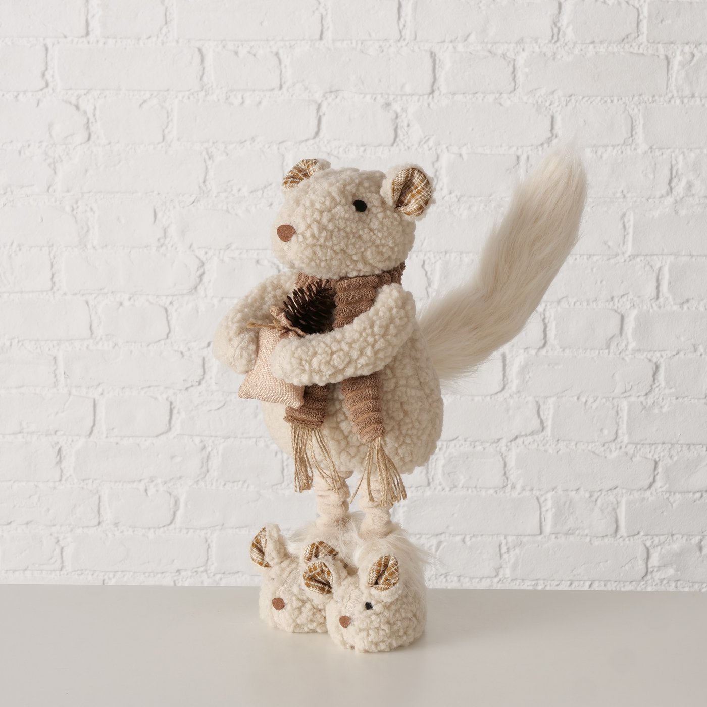 Die Kombination aus weichem Plüsch und stabiler Verarbeitung sorgt für eine angenehme Haptik und einen sicheren Stand. Die liebevollen Details wie Schal und kleines Säckchen unterstreichen den warmen, natürlichen Look im gemütlich-rustikalen Stil.