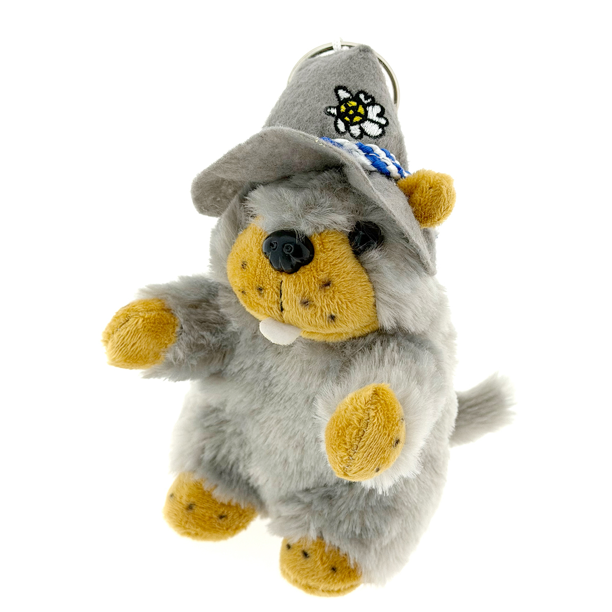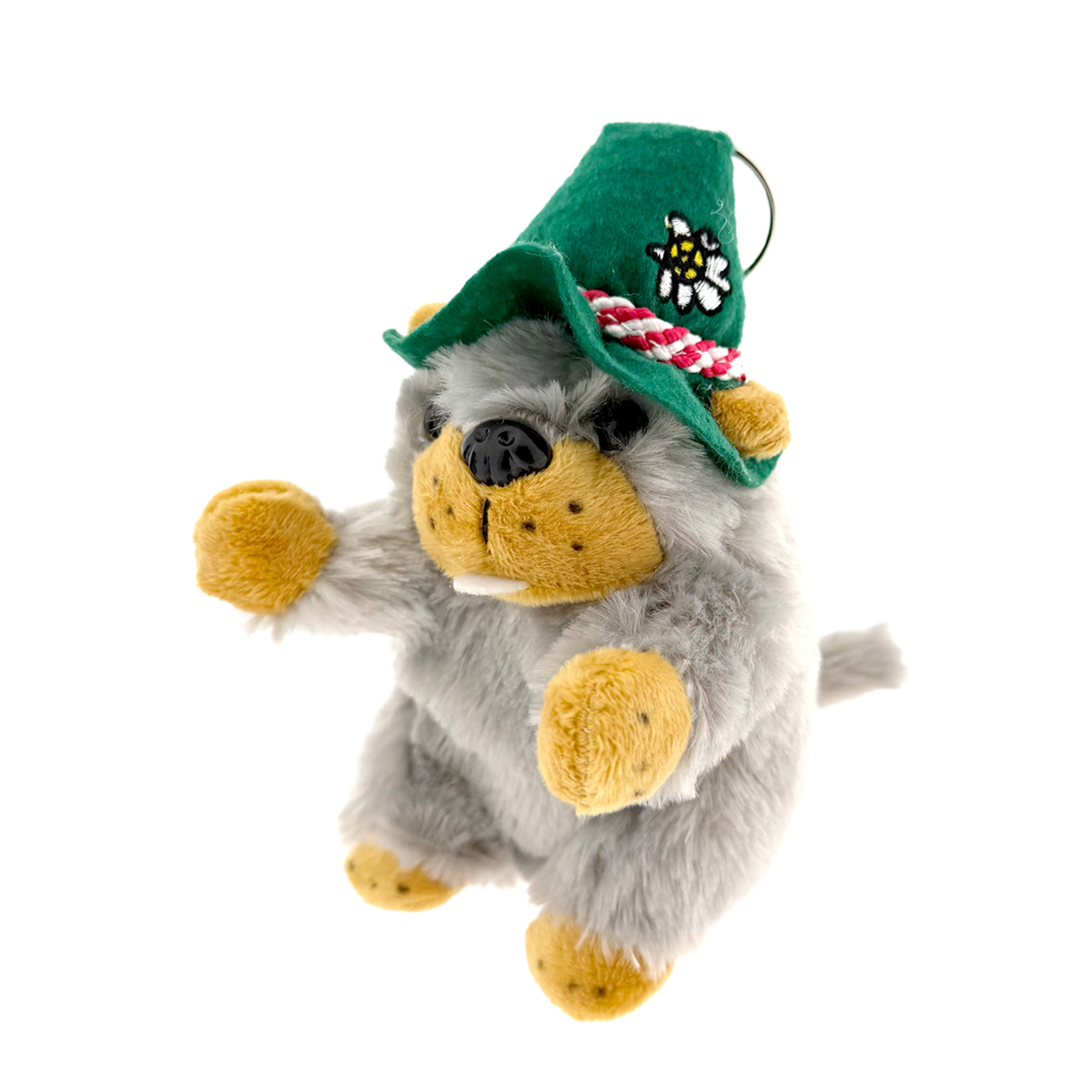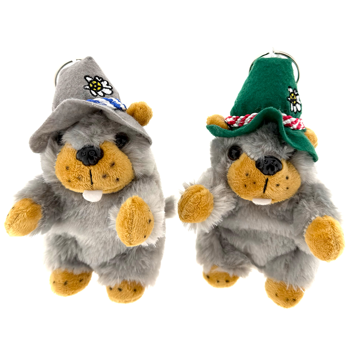 Dieses kuschelige Murmeltier trägt entweder einen grünen oder grauen Hias-Hut mit Edelweiß und weiß-blauem Hutband und ist bereit für jede Bergtour, jeden Rucksack und jedes Oktoberfest.