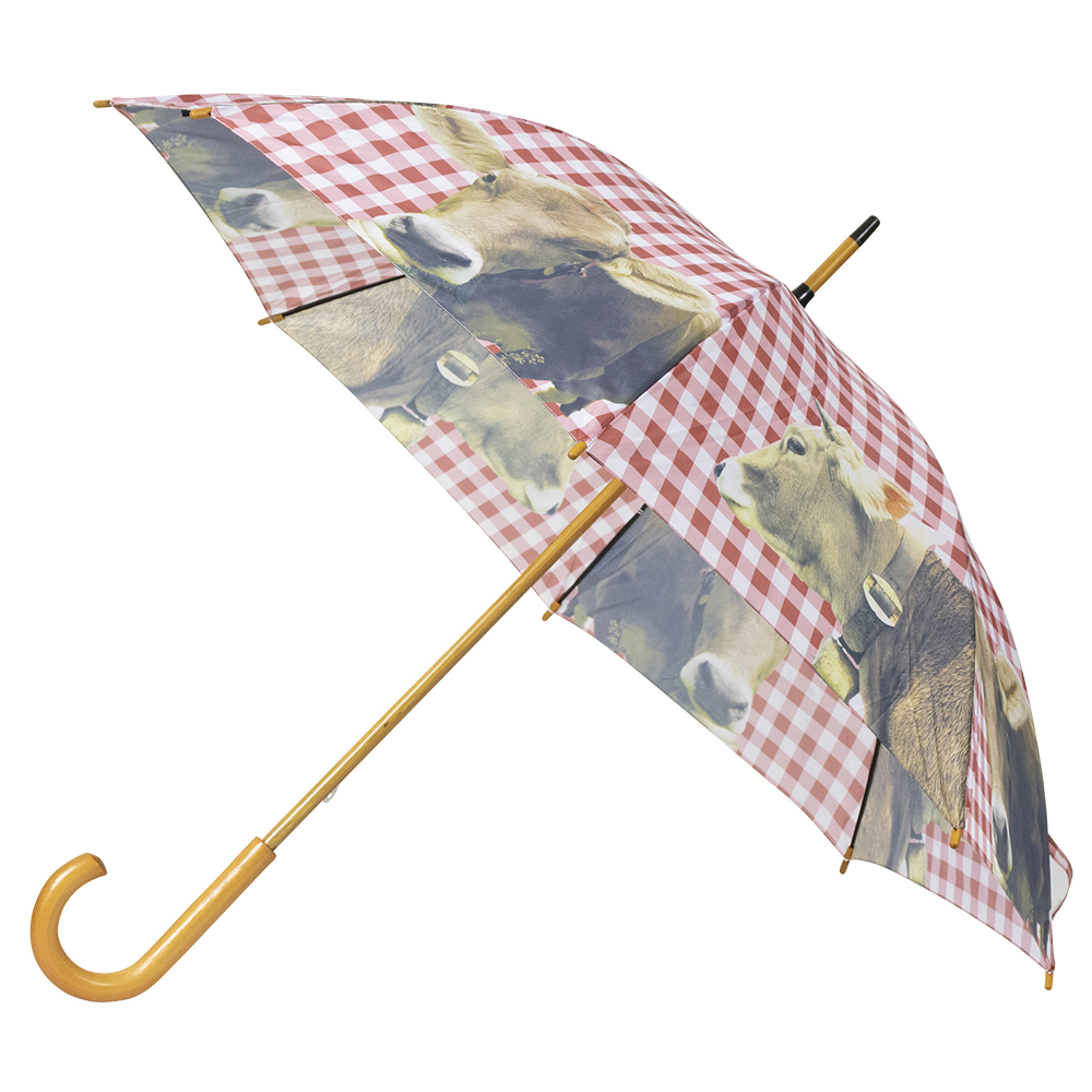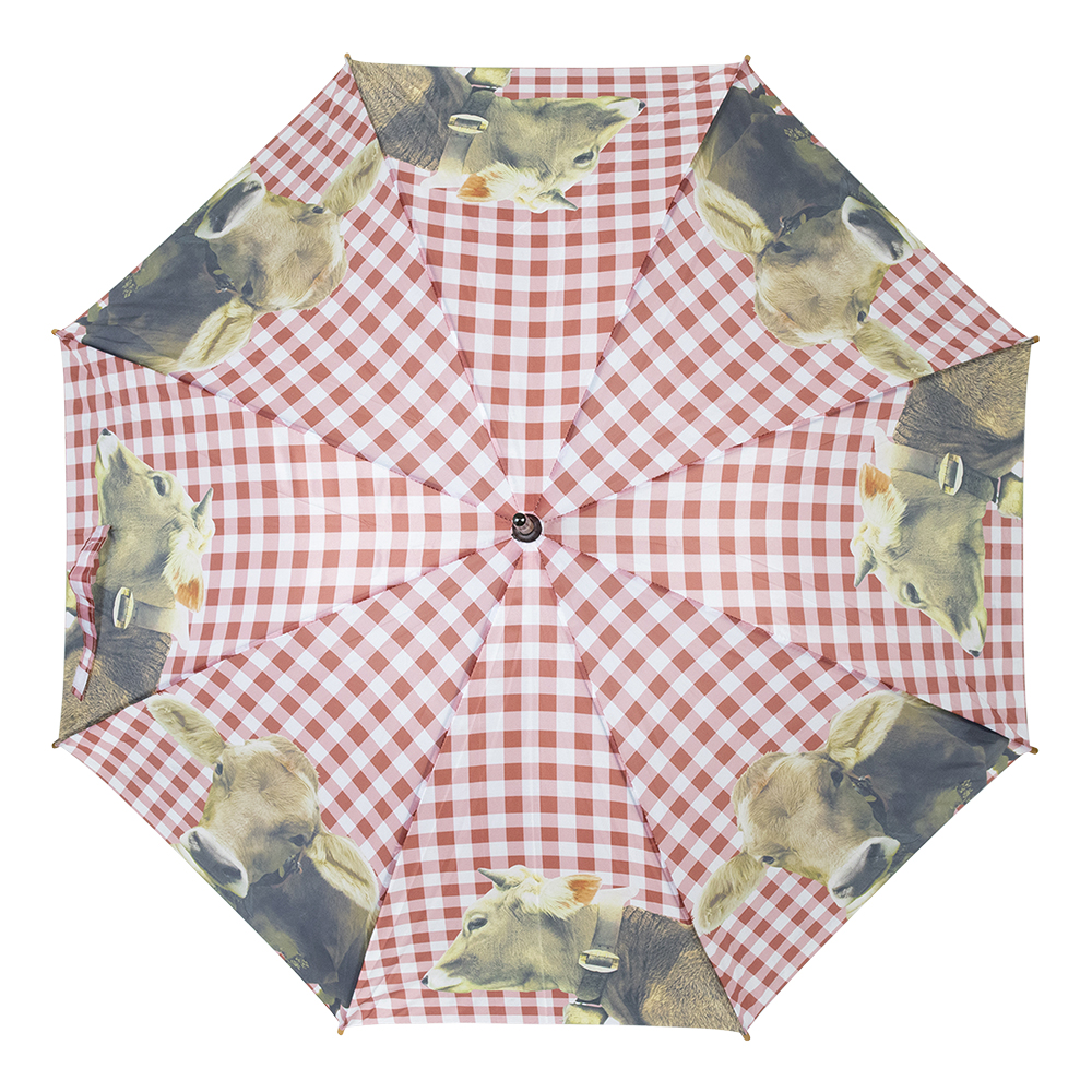 Regenschirm Kuh, Schweizer Kuh mit Glocke, Karomuster rot, 105cm, Holzgriff, Mars & More