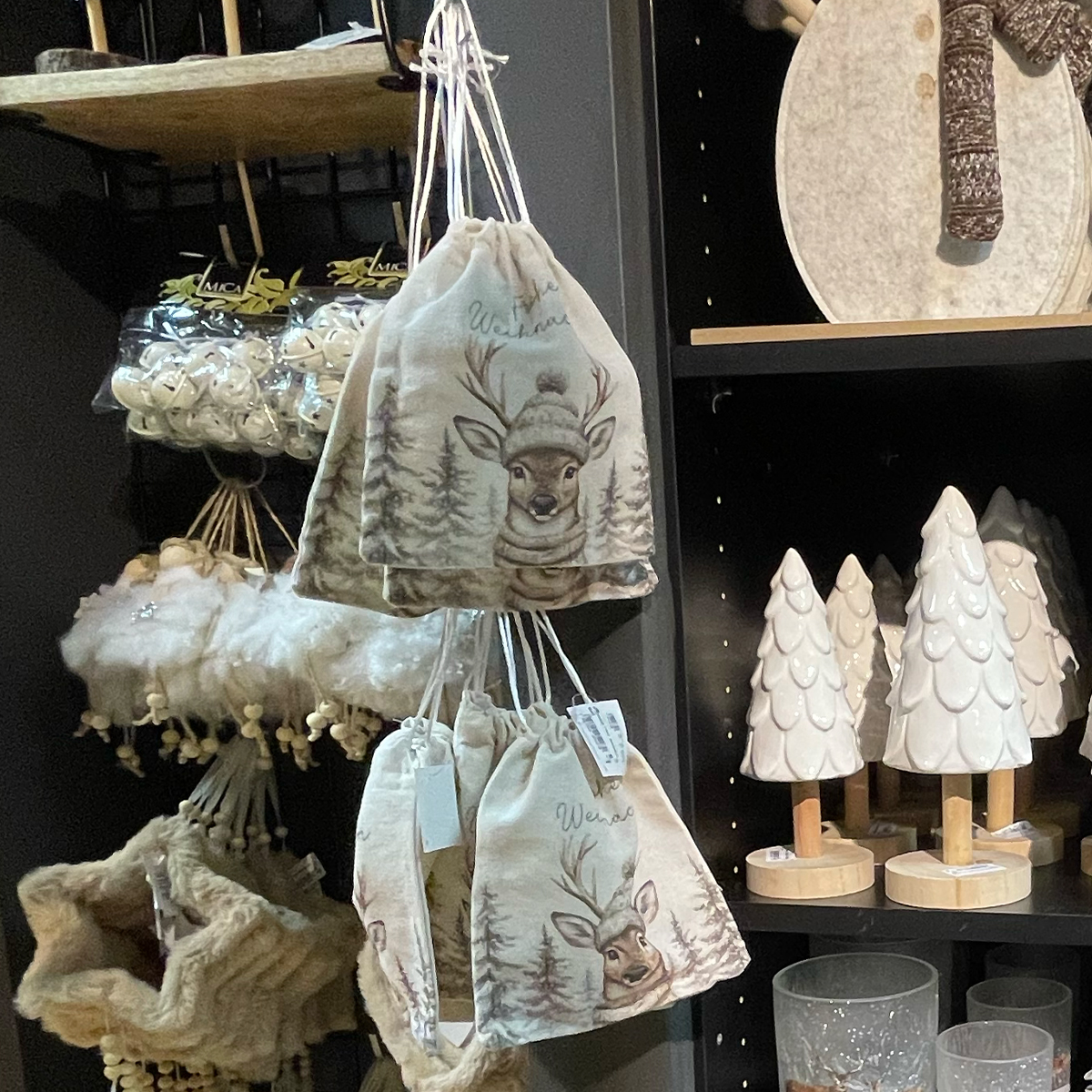 Stoffbeutel Frohe Weihnachten, Jutesäckchen mit Winter-Hirsch, 16x19cm