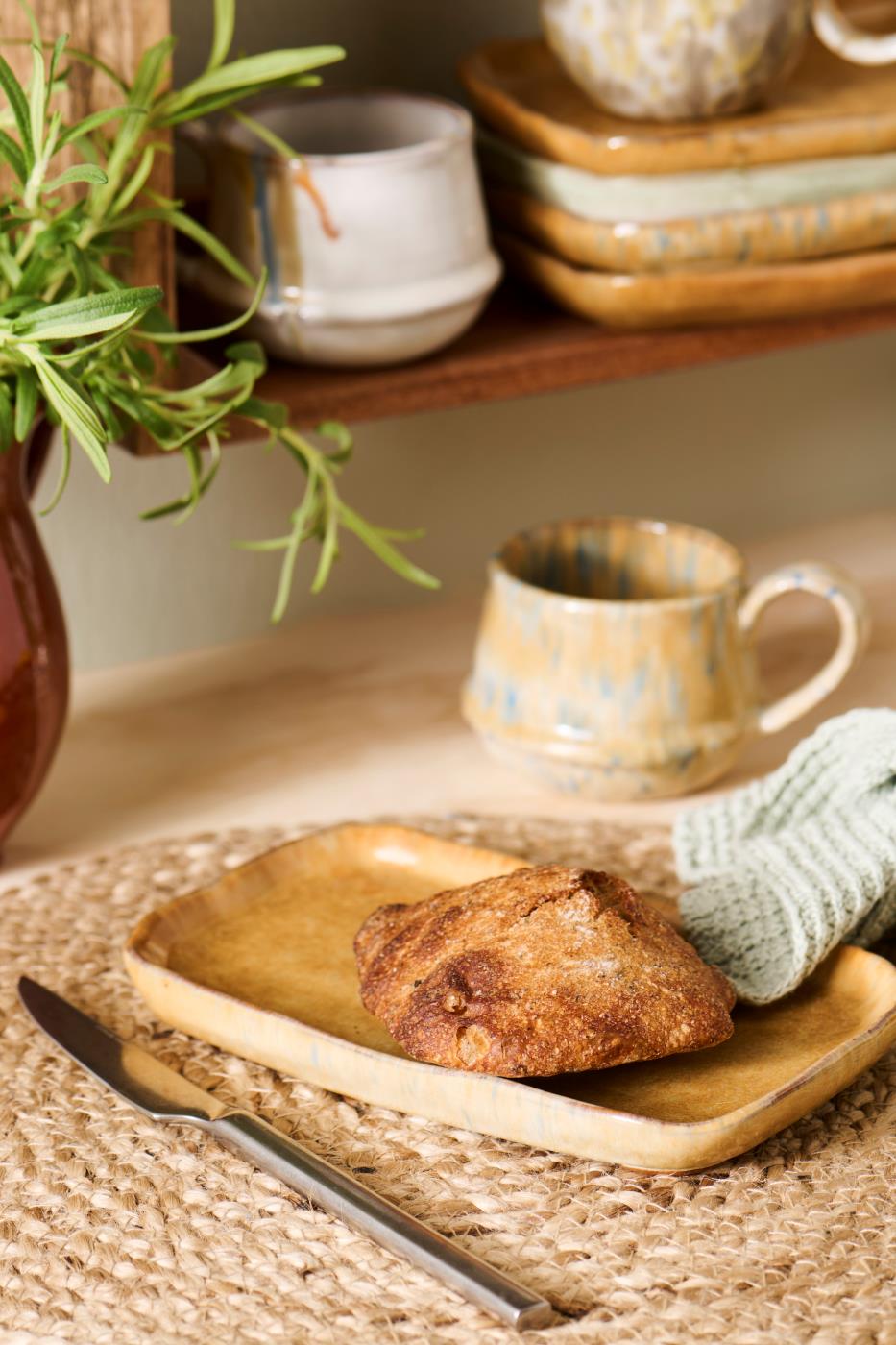 Dieses längliche Steinguttablett zeigt sich in einem warmen Mustard-Ton, der sofort Gemütlichkeit und natürliche Wärme ausstrahlt.