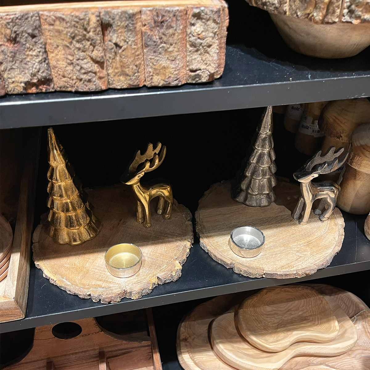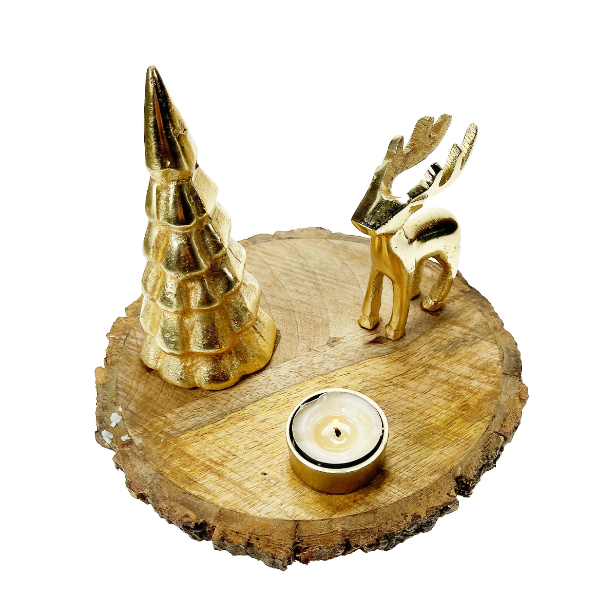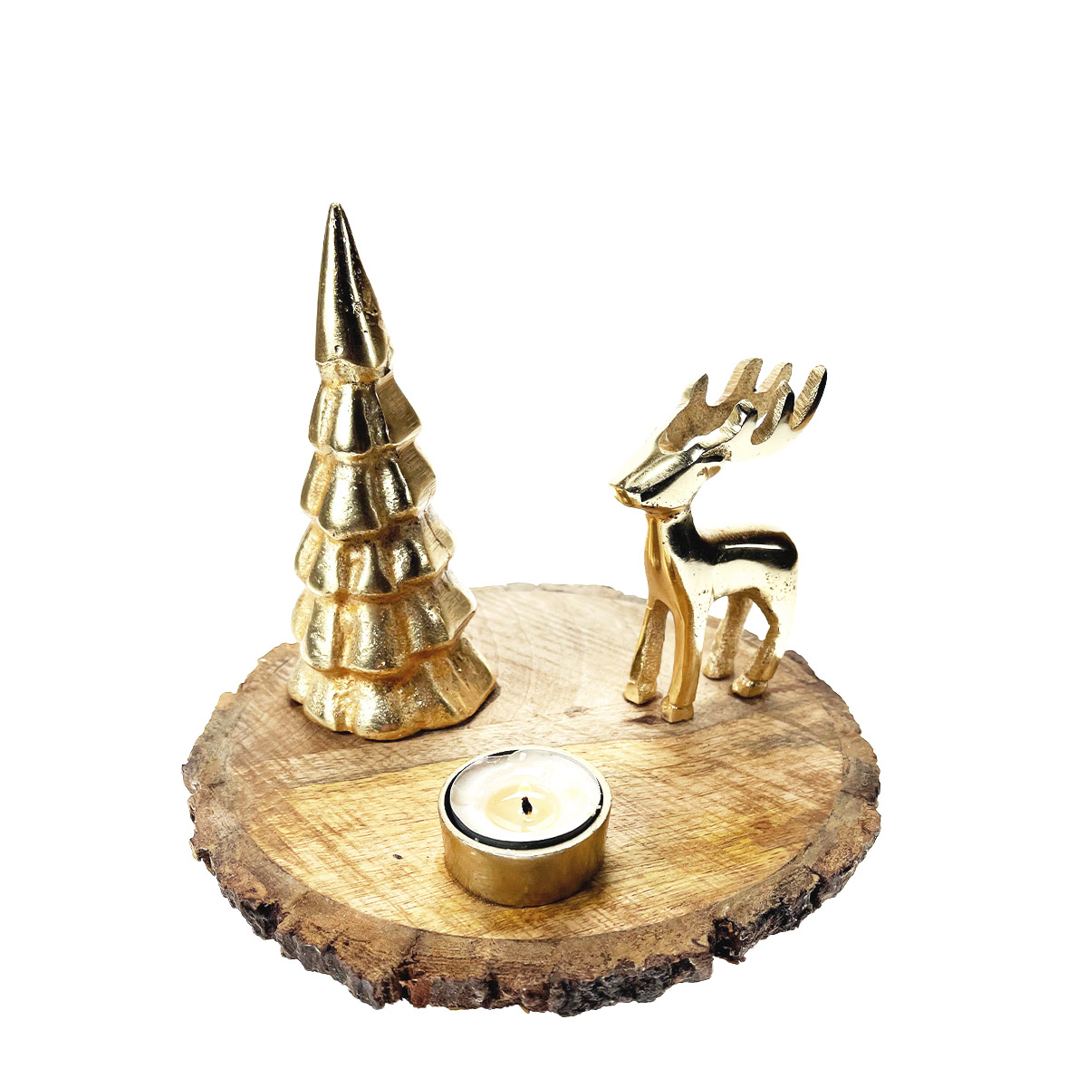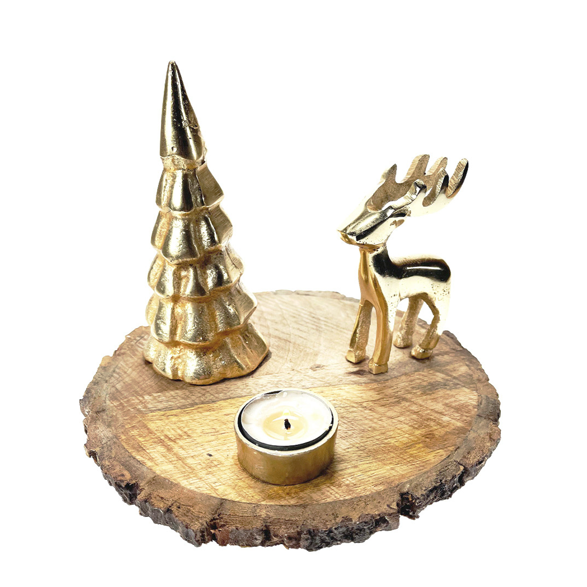 Teelichthalter Hirsch, Holztablett mit Hirsch und Tannenbaum, gold, Ø22cm