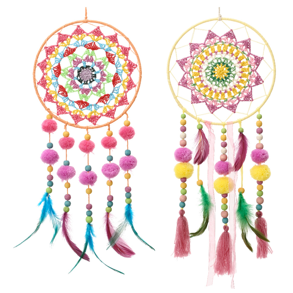Traumfänger Boho bunt, Dreamcatcher mit Pompons pink und gelb, Ø20cm