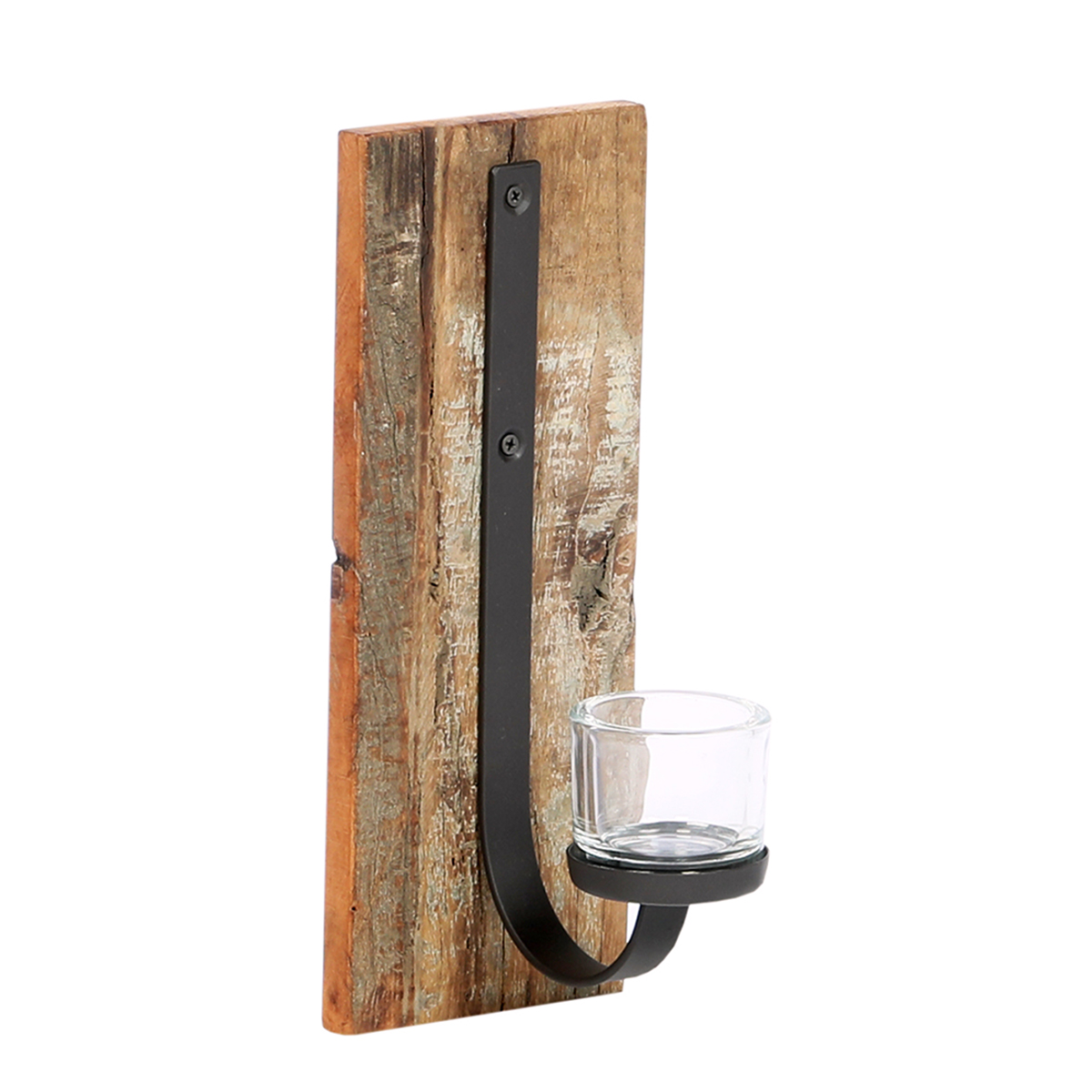 Wandleuchter Windlicht Rhinno, rustikaler Eisenleuchter auf Naturholz, 30cm, WMG Grünberger