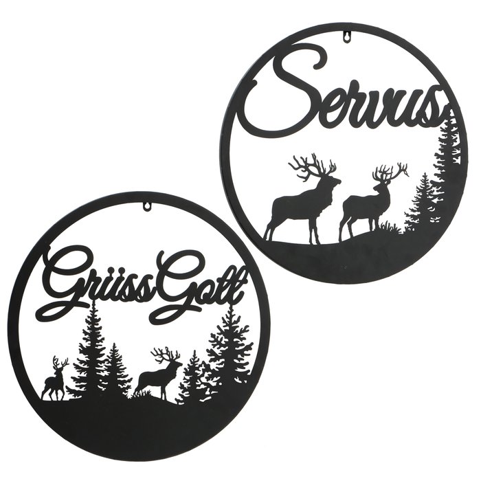 Wandobjekt Hirsch Ludwig, Metallschild mit Spruch: Grüss Gott, Ø50cm, Boltze Home Collections