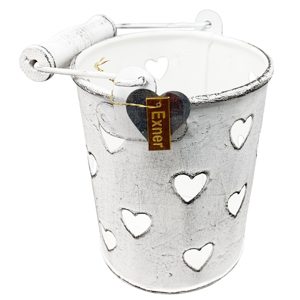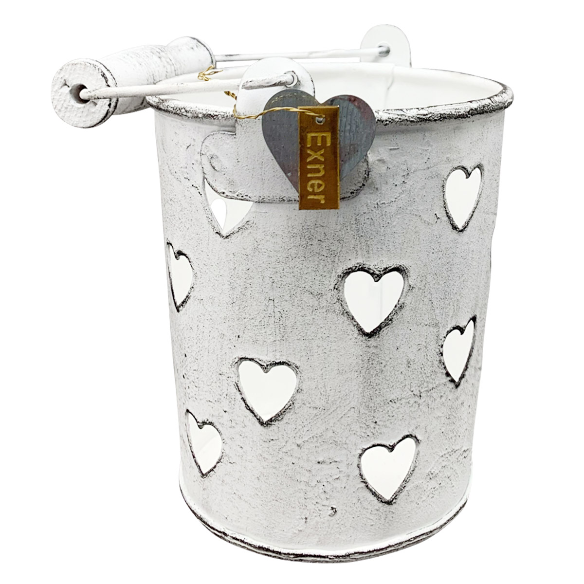 Windlicht Eimer mit Henkel und Herzen, Metalleimer weiß used look, 10x9cm