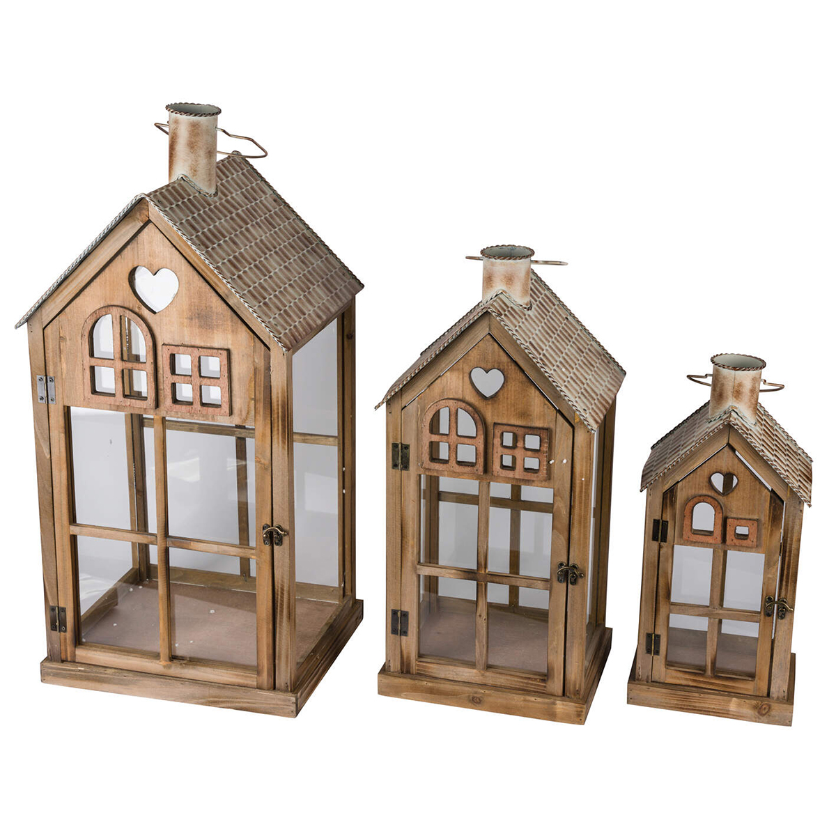Windlicht Haus Naturholz, Holzhaus mit Herz und Metalldach, 42cm