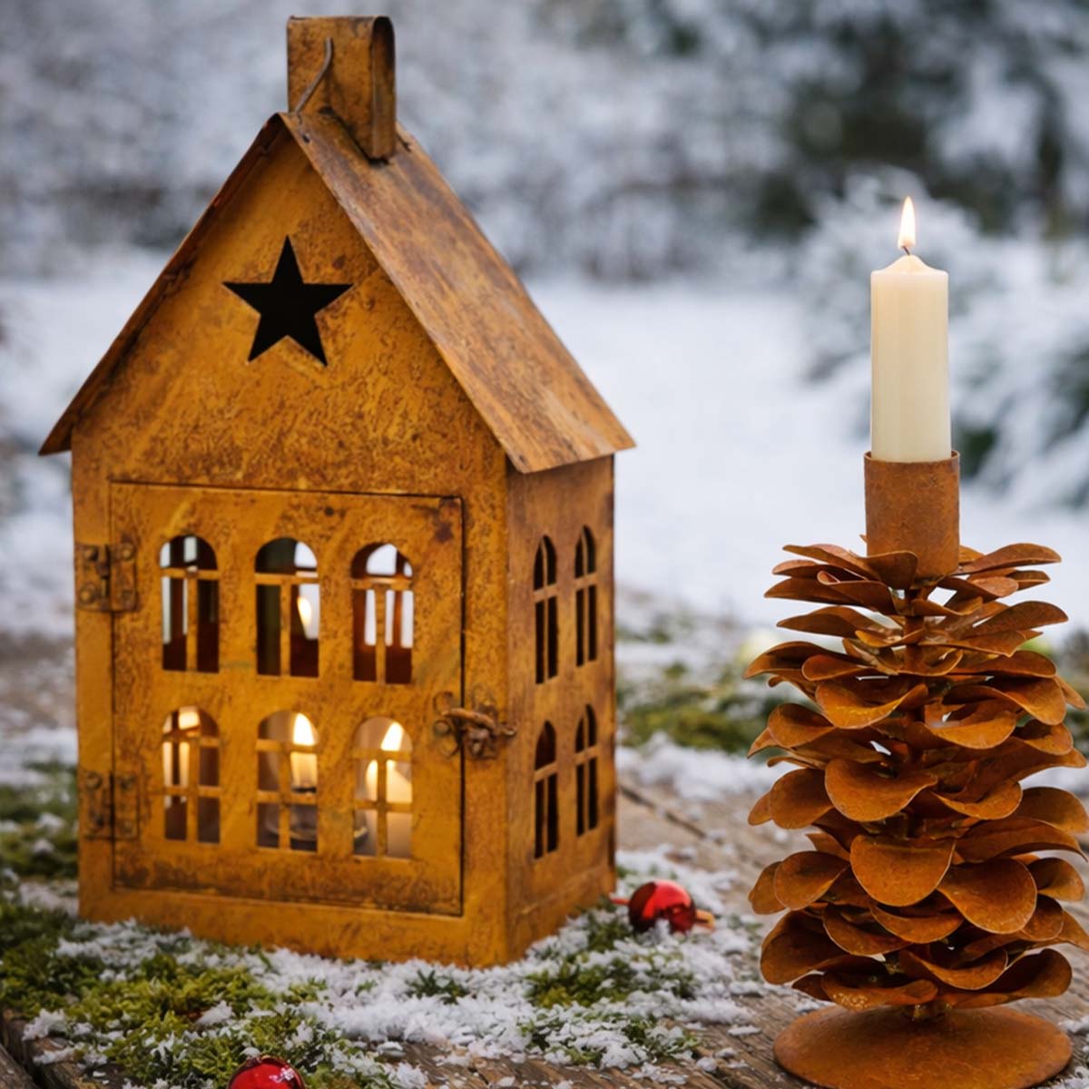 Gefertigt aus Metall mit echter Rostoptik, strahlt es einen natürlichen, leicht nostalgischen Charme aus, der besonders schön zu Landhausstil, Herbst- und Winterdekorationen passt. Der ausgestanzte Stern im Giebel sorgt bei Kerzenschein für ein stimmungsvolles Lichtspiel, während die Fensteröffnungen das Licht sanft nach außen tragen.