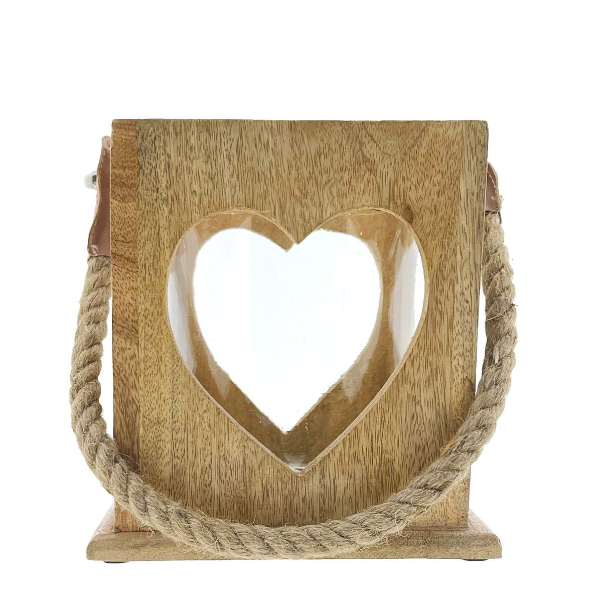 Windlicht Herz Natur, Holzlaterne mit Jutegriff, 17x15cm, Mangoholz