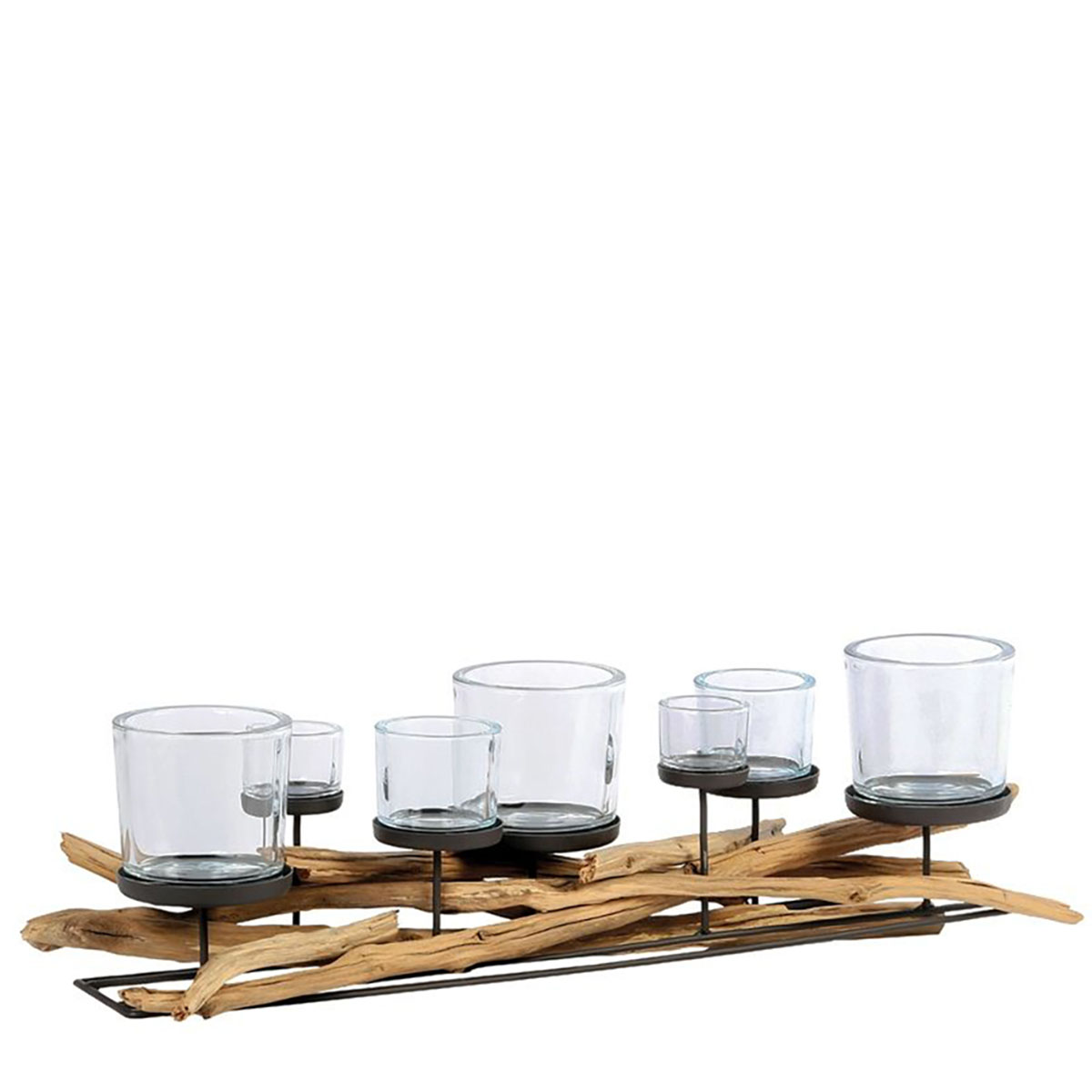 Windlicht Lincoln Schwemmholz, rustikaler Naturholzleuchter mit 7 Gläser, 80cm, WMG Grünberger
