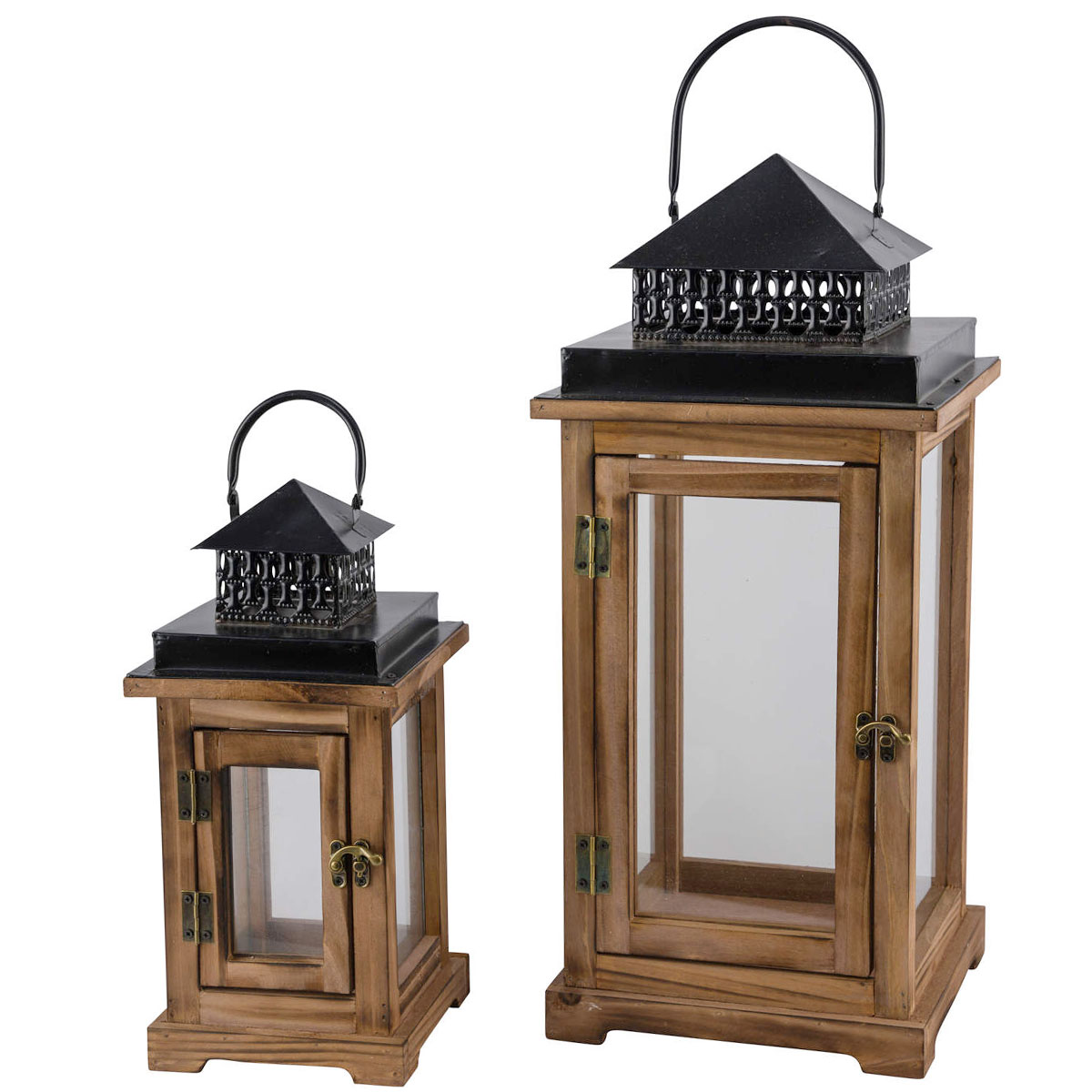 Windlicht Naturholz, braune Holzlaterne mit schwarzem Metalldach, 50cm