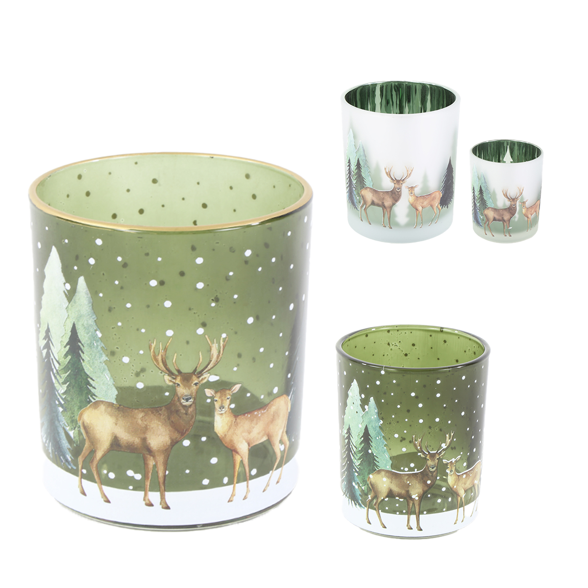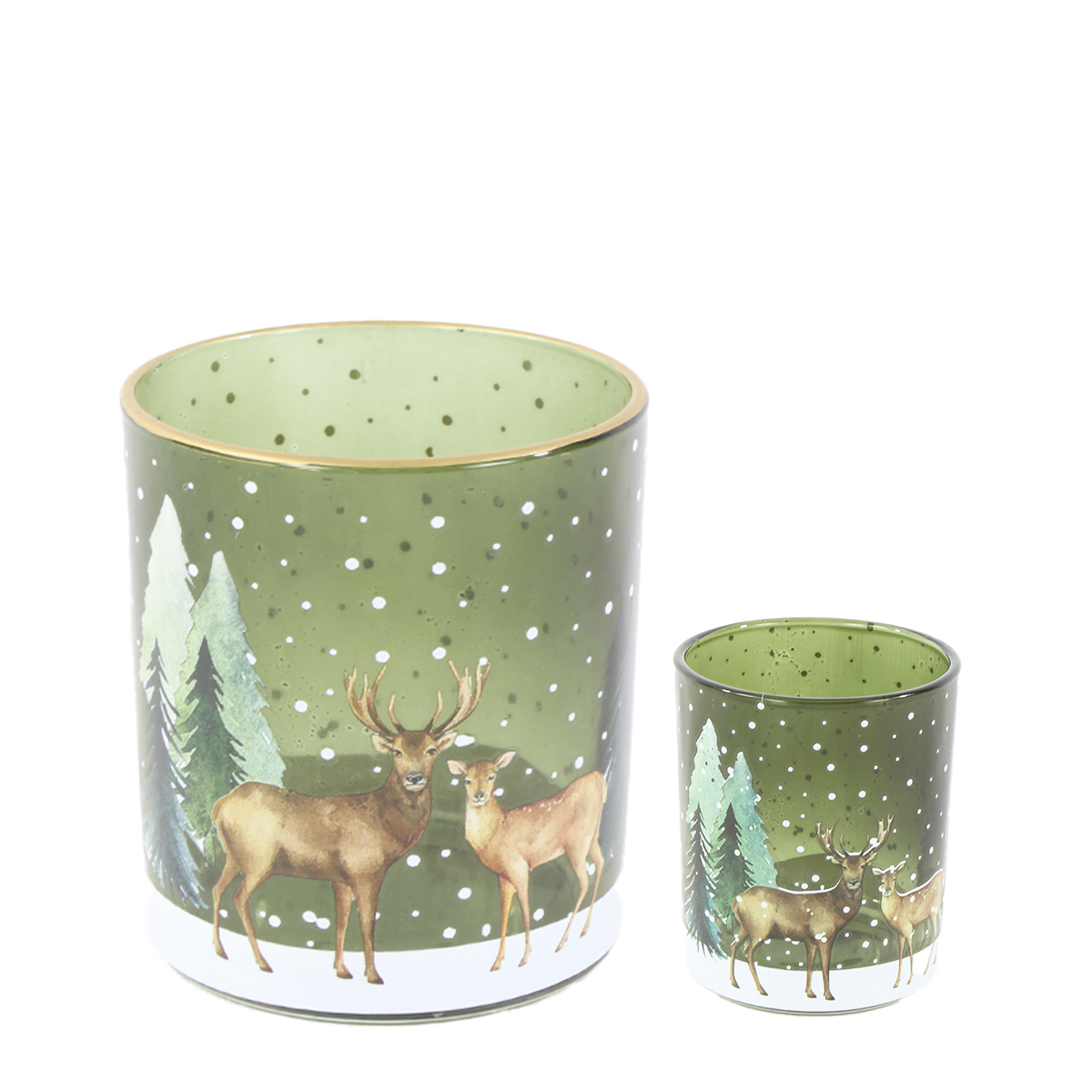Windlichtglas Winterwald, Hirsche und Reh im Wald, grün, 7x8cm