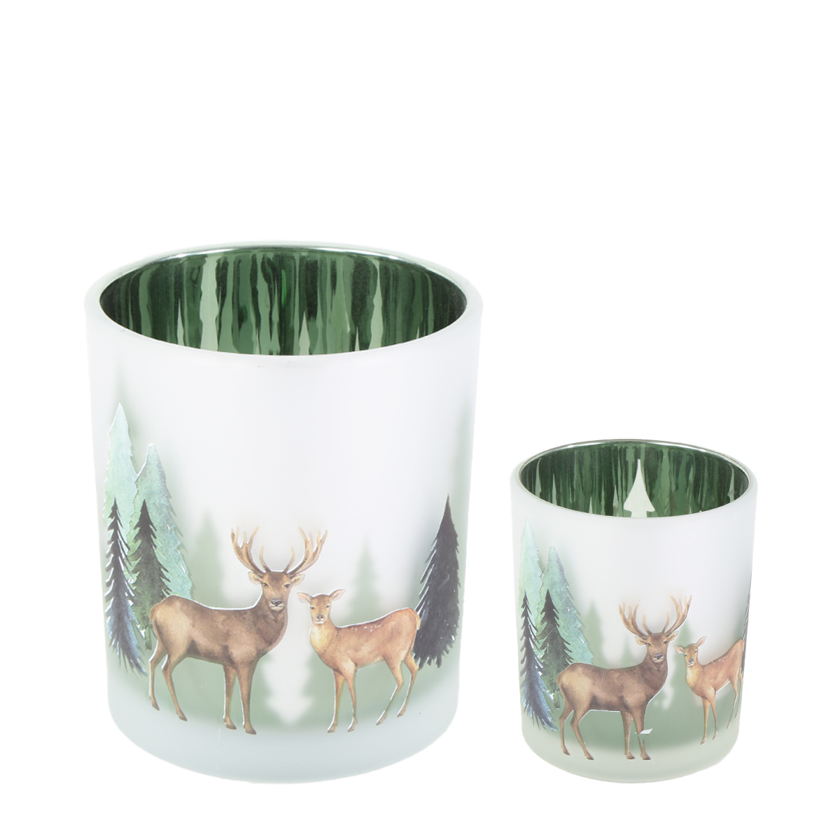 Herstellerinformationen zu "Windlichtglas Winterwald, Hirsche und Reh im Wald, matt, grün, 7x8cm"