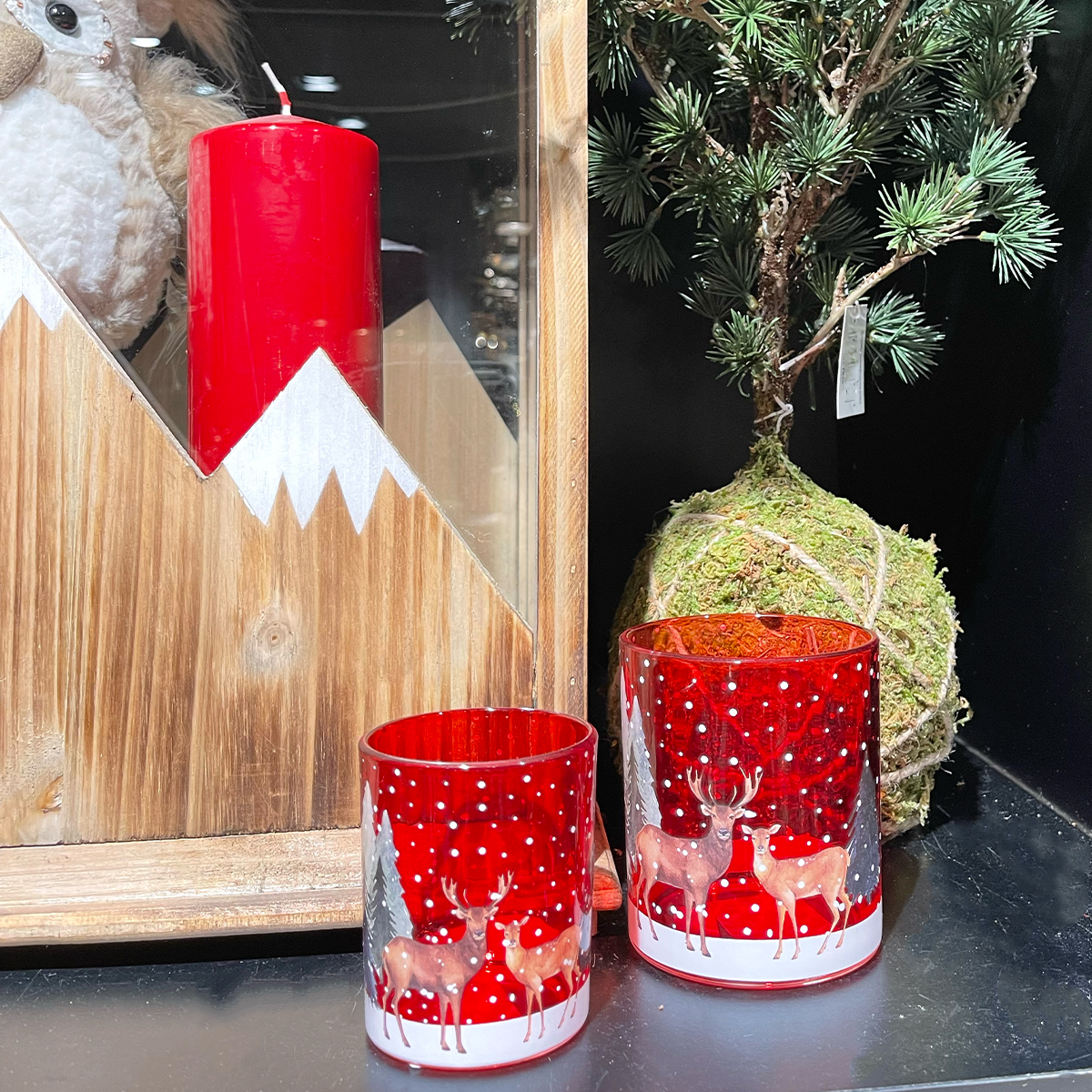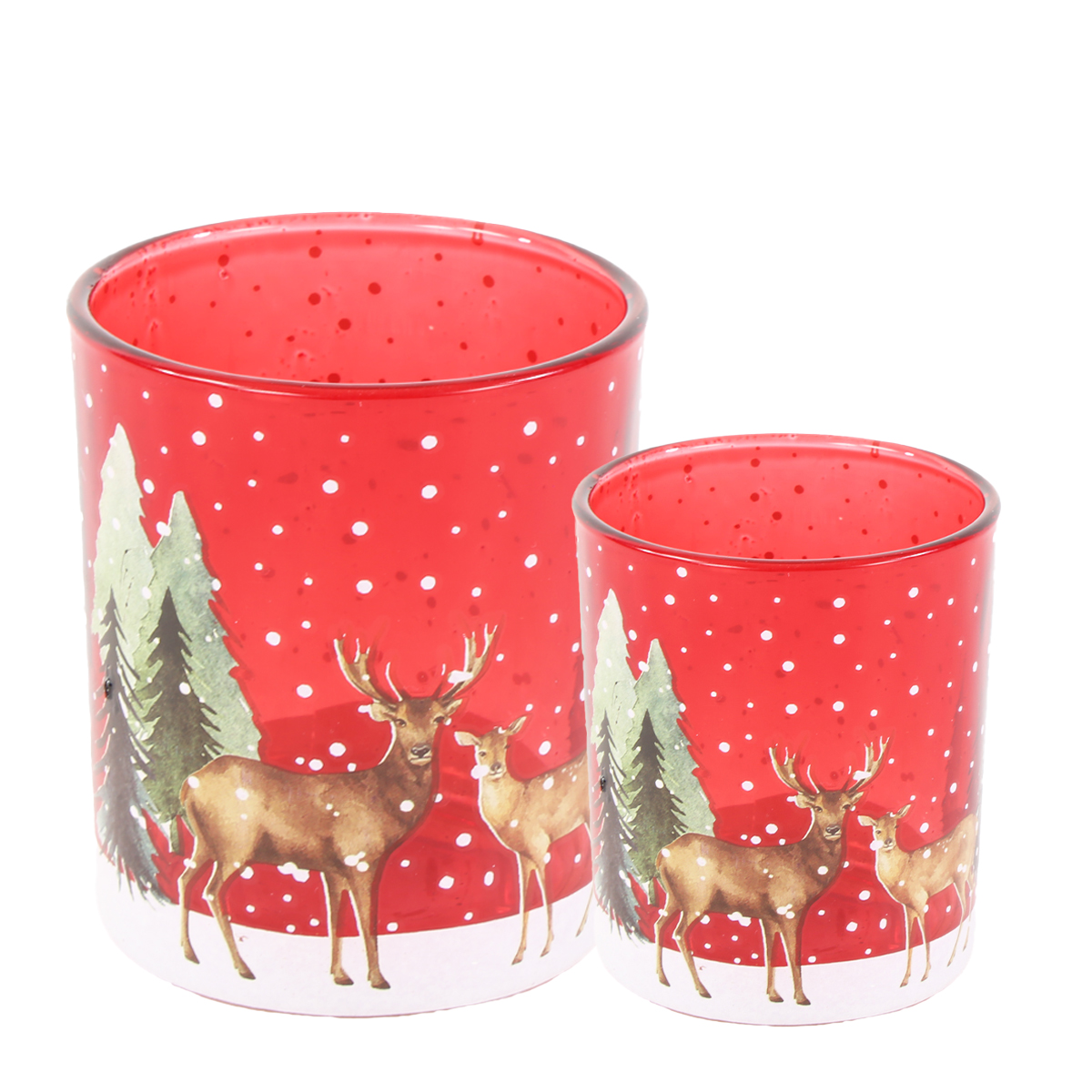 Herstellerinformationen zu "Windlichtglas Winterwald, Hirsche und Reh im Wald, rot, 7x8cm"